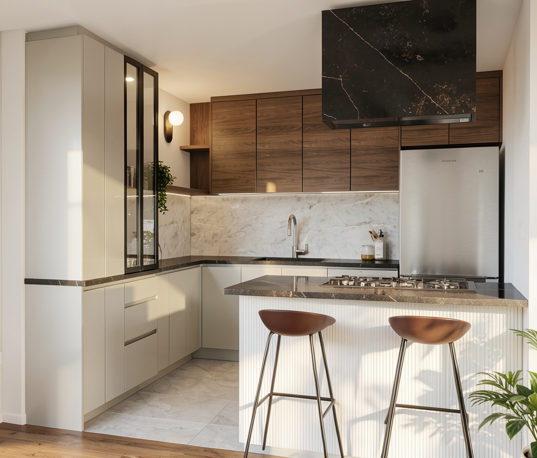 create a realistic rendering of a two story modern suburban house the house should have a mix of white and darker grey siding with dark grey accents on the windows and garage doors the roof is dark grey and there are dark grey window frames surround the house with a lush green lawn with grass field and tree line in the background the middleground should look like a neighborhood the sky is dreamy with light golden fluffy clouds and a romantic blue sky indicating a sunny day the atmosphere is serene and inviting capturing a warm welcoming suburban environment