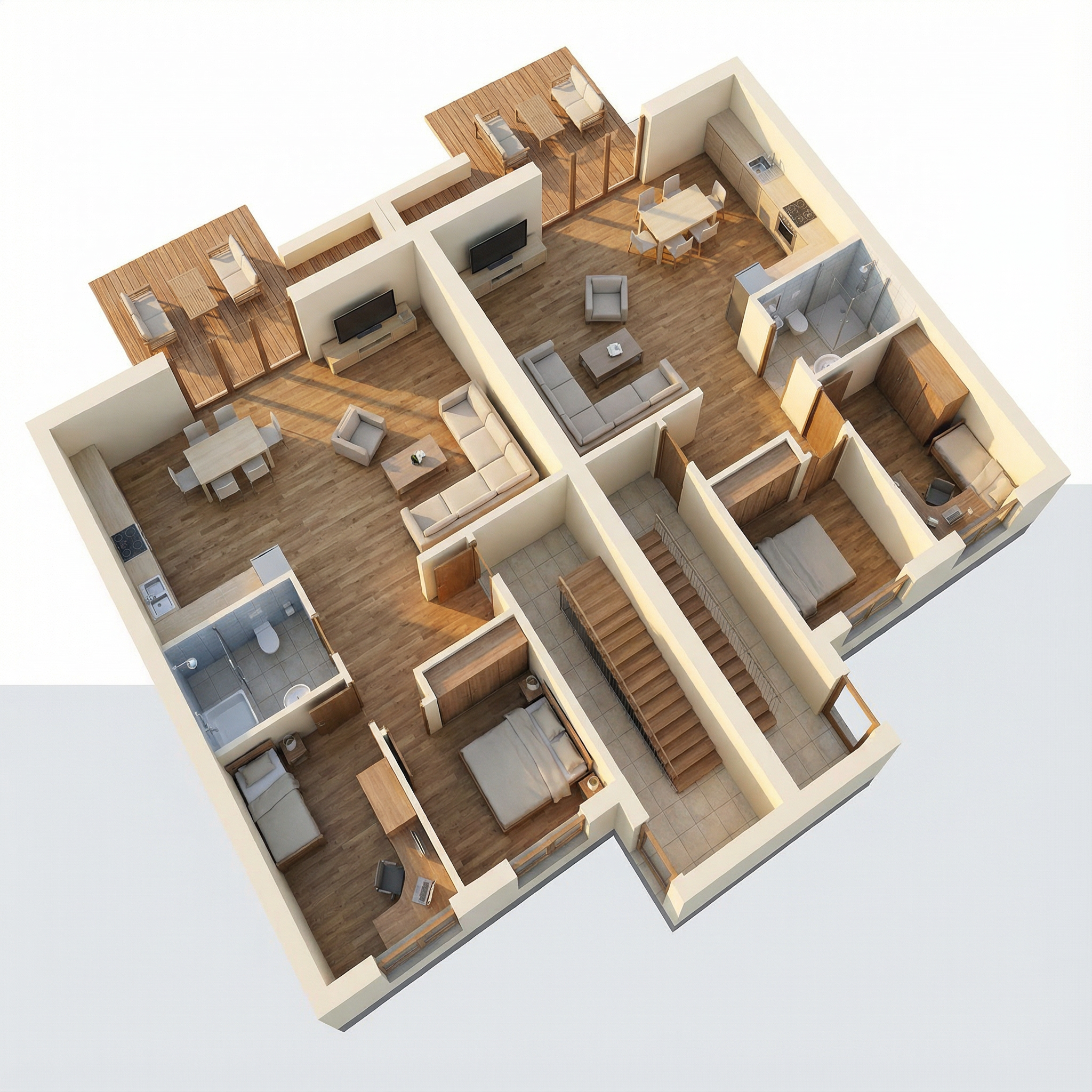 convert this floor plan into a realistic isometric 3d view of a full house show the space from an elevated angle with furniture walls and details visible design rooms in a minimalist style use the same furniture as shows on the plan do not change the orientation of the floorplan