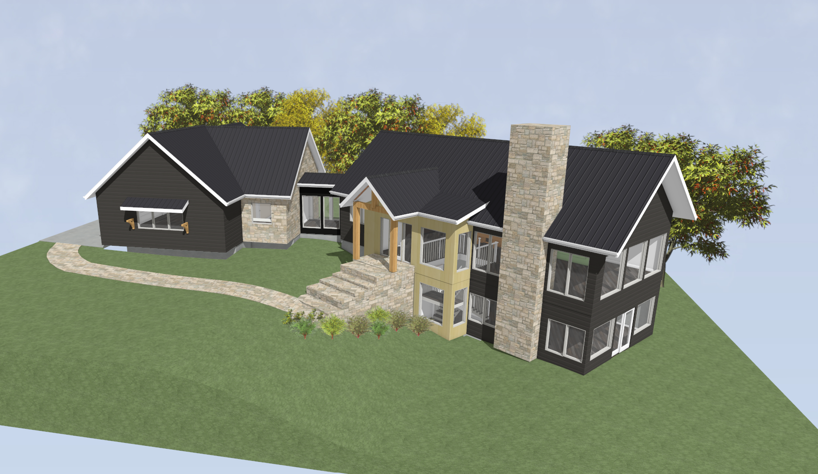 place this home onto a heavily wooded lot in the summer add landscaping golden hour lighting rustic features