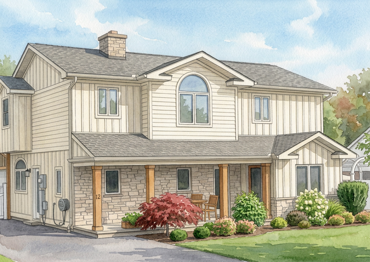 photo realistic with a cafe bar on the left inside and a the seating area that is lounge like on the right sidewalk is right the a strip of grass with 2 large trees then the street with cars parked parllel