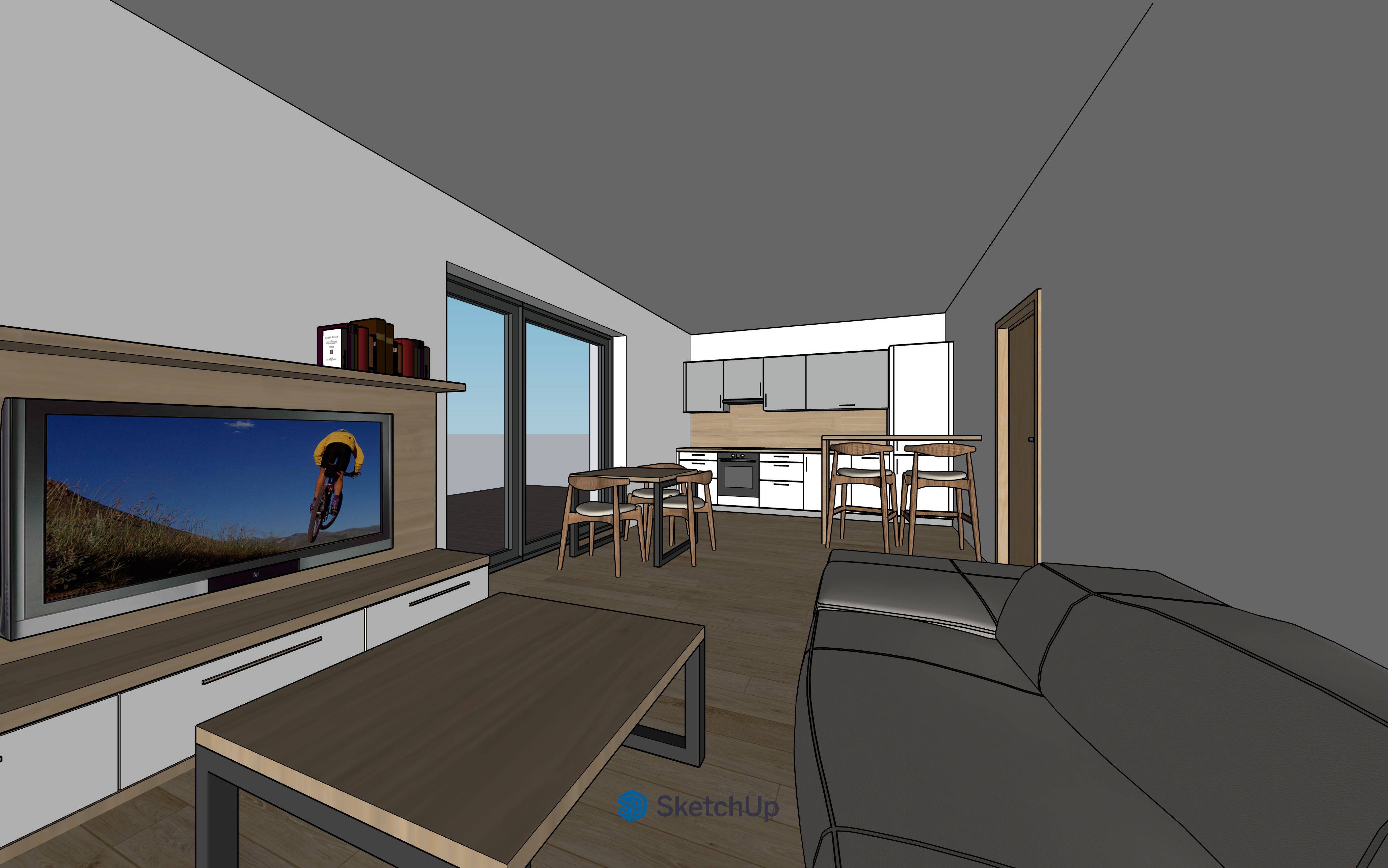 interior shot modern interior design open plan living room and kitchen stylish and minimalistic sleek furniture with a wooden coffee table and dining set charcoal grey couch light oak wood flooring large glass doors with subtle blue reflections white and light grey walls warm ambient lighting soft shadows books on a wooden shelf realistic texture on tv screen showcasing a vibrant nature scene cozy and inviting atmosphere