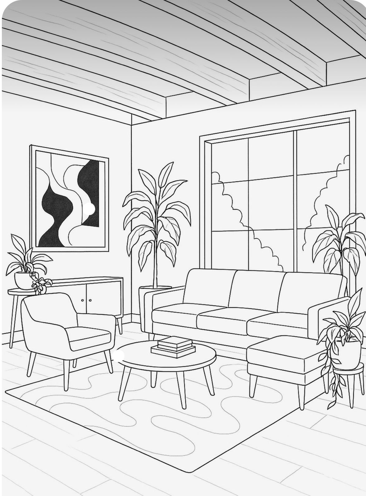 a realistic high quality 3d render of a modern living room with soft muted colors the scene includes a cozy sofa armchair and a circular coffee table the armchair has a subtle blue accent the room features large windows allowing natural light to fill the space casting soft shadows across the floor the natural light is mixed with warm artificial lighting to create a soft balanced ambiance the plants are vibrant and the flooring has a wooden texture the overall atmosphere is serene and calming with an emphasis on realistic textures and lighting effects including shadow play on the floor and walls high resolution photorealistic rendering with detailed furniture and decor