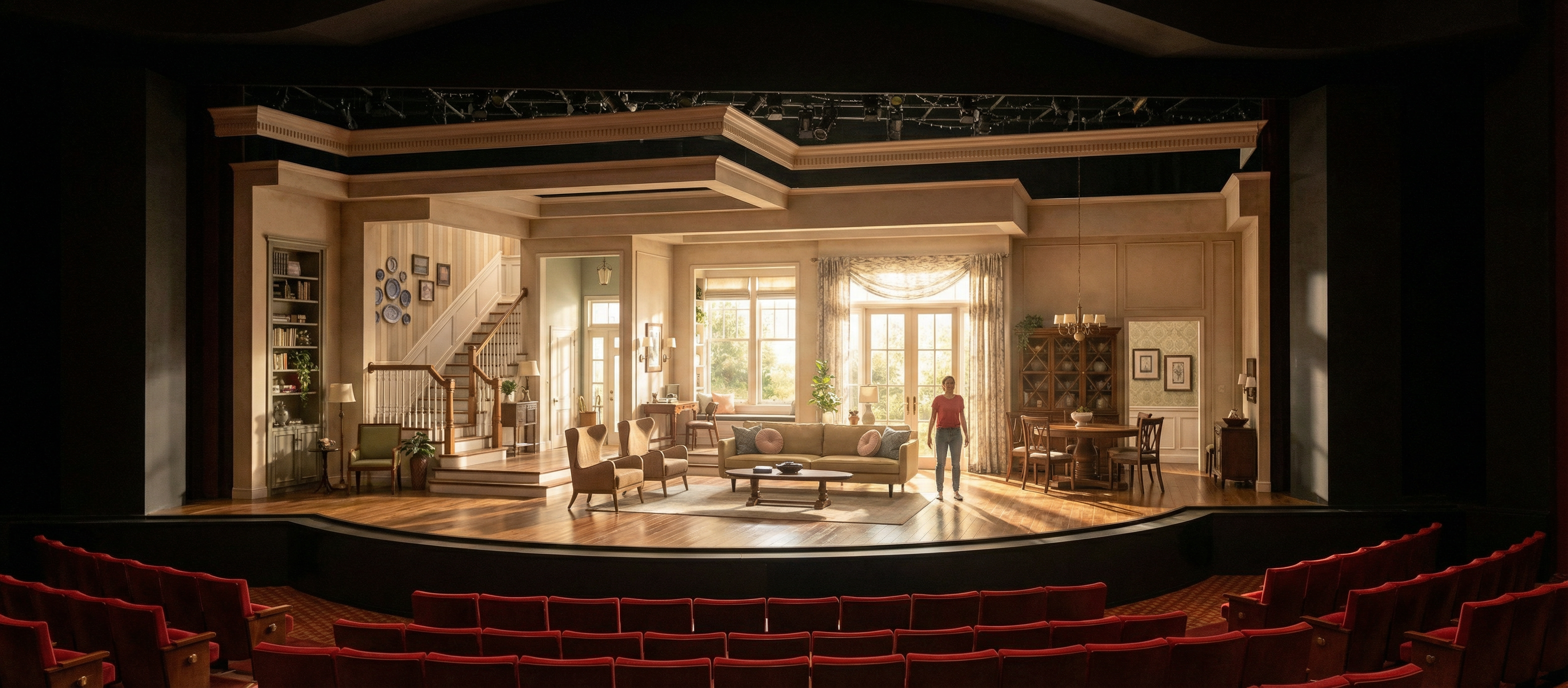 create theatrical stage design with sunshine coming through windows and theeatre light fixtures shining from above