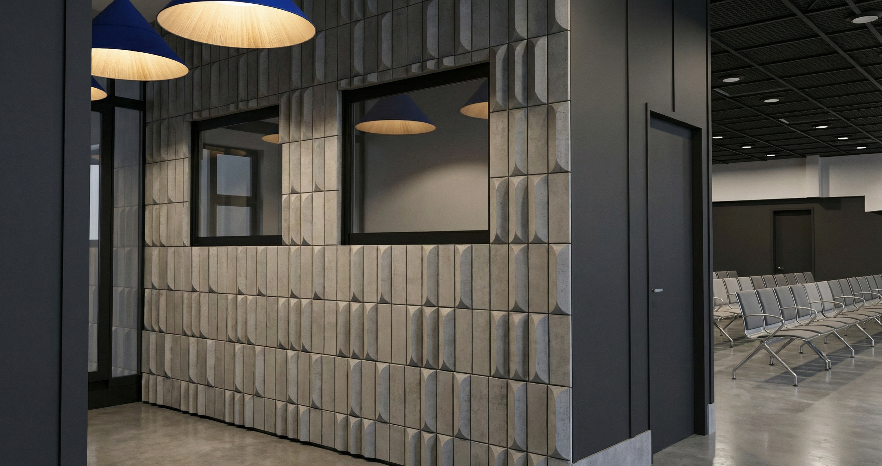 replace black background with soft black drape polished concrete floor blurred business people with lanyard walking past