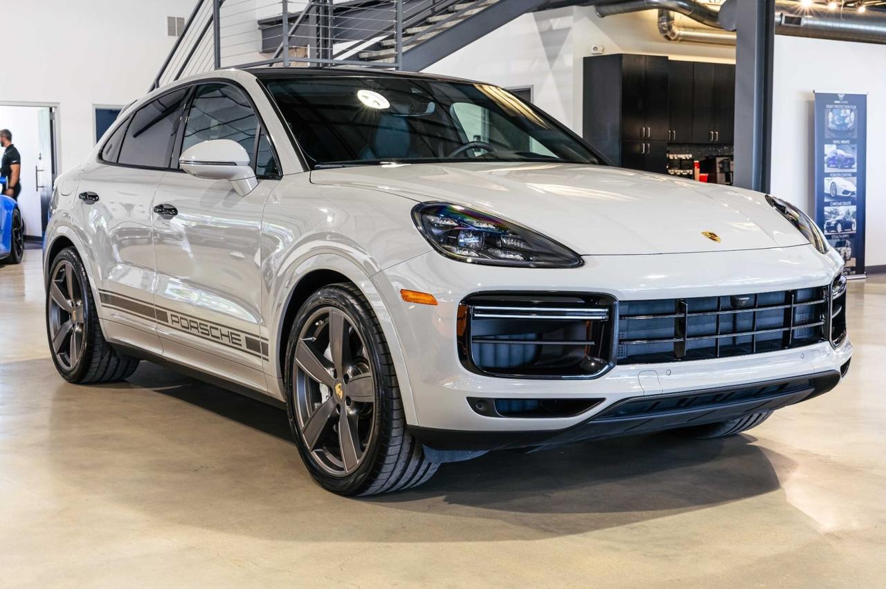 convert to a lifted 2020 porsche cayenne turbo coupe with large oversized offroad tires steel bullbar with large rally round offroad lights a roof rack with overland gear and round offroad lights at front race stripes on the side