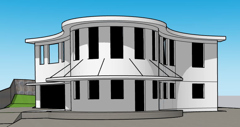 modern two story home with portuguese exterior tiles wild grasses in front yard and large walnut tree in front yard