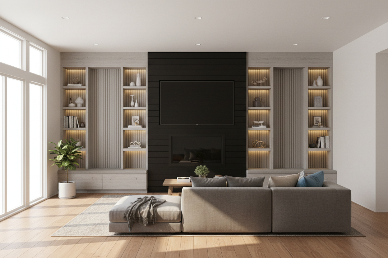 create ultra realistic images without changing any structure shape design or materials do not resize jpegs beige wood vinyl flooring plain off white walls add indirect light add outside view in the windows mirror shelf backsplash