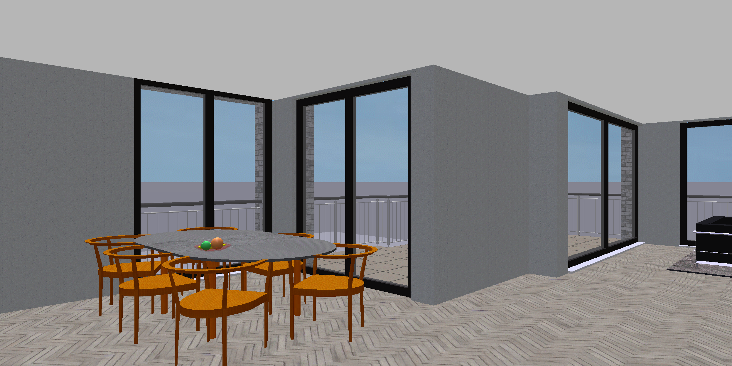 genau dieses rendering berarbeiten fotorealistisches innenraum foto exakt dieselbe perspektive und kameraposition wie das hochgeladene referenzbild 100 identische raumgeometrie exakt gleiche m belanordnung exakt gleiche verlegeart und richtung von parket wie vorlage exakt identische fensterpositionen mit gleichem ausblick auf den z richsee 40 meter tiefer durch die fenster seeaufw rts richtung berge weiches nat rliches tageslicht leicht schr g einfallende sonne durch die grossen fenster geschlossene r ume k nstlich ausleuchten sanfte realistische schatten blickrichtung ist nach s den sonnenlicht kommt von westen realistische materialien echte holztexturen stoff mit leichten gebrauchsspuren hochwertige oberfl chenreflexionen fensterrahmen dunkelbraun kleine gr npflanzen tisch ersetzen mit ovalem tisch original hermes m tiers 250x140 cm mit marmor collemandina grigio in braungrau dunkel mit runden braunen tischbeinen blumen auf dem tisch sechs stylische st hle genau modell m tiers von herm s bezug sitzfl che in braunem leder mit stuhlgestell aus nussbaumholz f nf leuchten von eloa unique lights klarglas in verschiedenen gr ssen und unterschiedlichen h hen parket ruhig und hellgrau alle grauen w nde sind sichtbeton mit modernen leichten vorh ngen in graubeige runde filigrane schwarze einbauspots vor den fensterfronten sehr moderner minimalistischer look aussen offene ungedeckte terrasse nat rliche farbwiedergabe golden hour feeling bettina eine echte frau mit blonden haaren steht rechts neben dem tisch im raum bettina ist eine attraktive sehr schlanke blonde frau exakt 170 cm gross kleidergr sse 34 xs sehr zierlich schmale taille ca 60 62 cm schlanke beine kleine schultern ca 48 52 kg mitte 40 m dchenhafte erscheinung sehr langes vollst ndig glattes hellblondes haar ovale gesichtsform hohe wangenknochen gerade nase volle lippen hellblaue augen dezentes nat rliches make up warmes offenes l cheln mit feinen lachfalten helle bis leicht gebr unte ebenm ssige haut selbstbewusste elegante ausstrahlung mit fendi sneakers und mit kleid von fendi das bild muss wie eine professionelle fotografie aussehen es soll ein echtes und reales foto sein canon eos r5 35 mm festbrennweite f 2 8 hyperrealistisch dslr qualit t raw aufnahme 8k aufl sung extrem scharf perfekte tiefensch rfe professionelle architekturfotografie