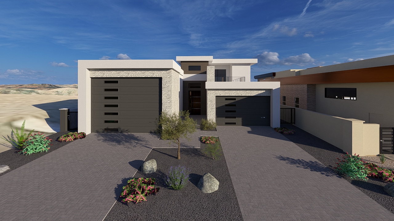 i have all the color tones on the house matched per plan do not change the tones of the colors or the geometry of the house i just want to make this image look more realistic the house sits in the lake havasu city arizona riviera can you make the backround desert look native to the area at which this house sits