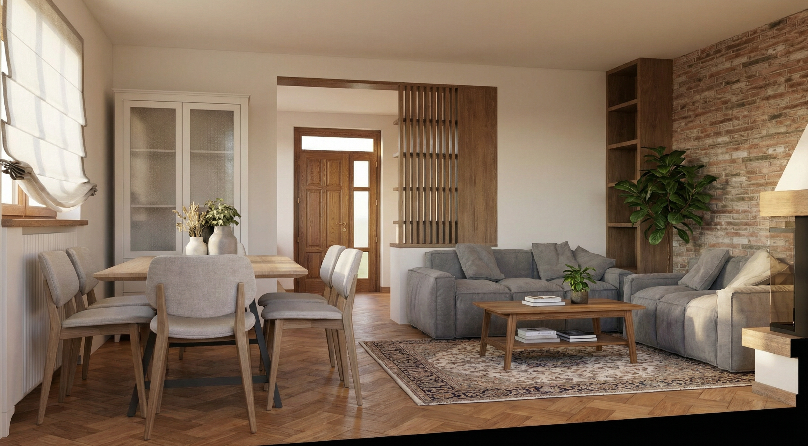 create an artist imperssion with planting to the outer edge of the grassed areas light grey windows and doors light rustic red roof pan tiles thin concrete pin edges to either side of red path set them at same level light cloudy sky summer golden hour