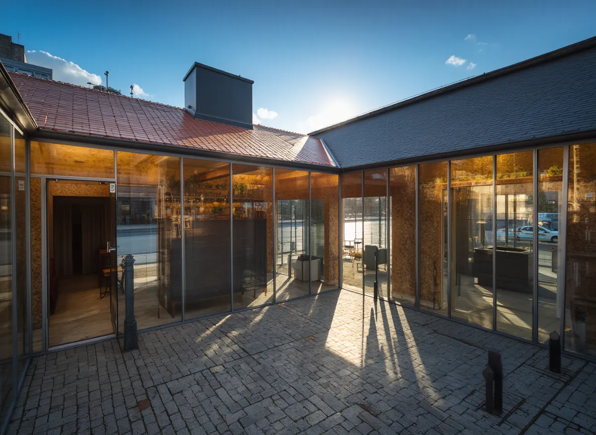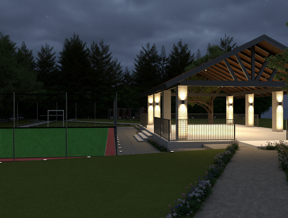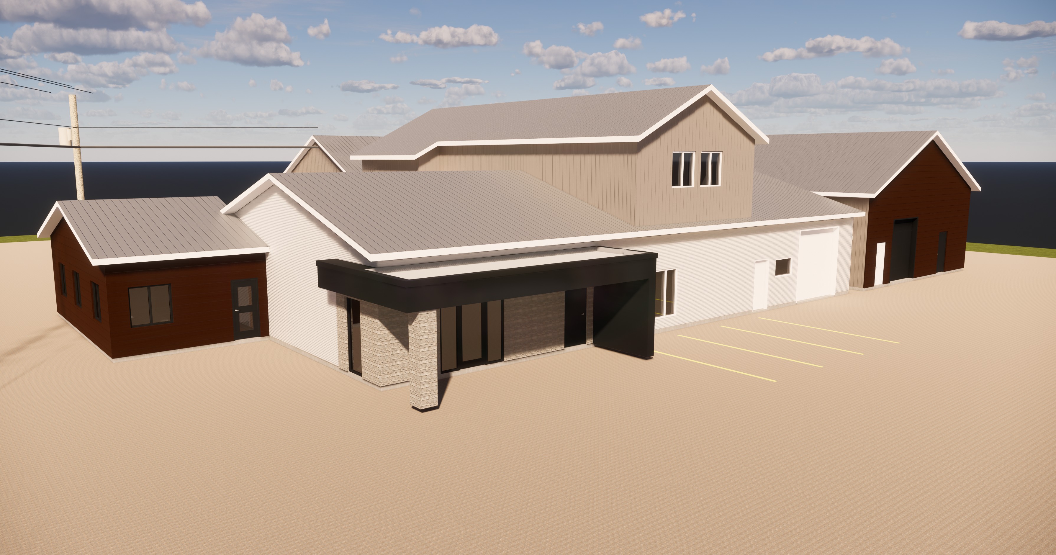 redesign the provided architectural image while strictly preserving the existing massing roof shapes and site layout contemporary institutional architecture with clean lines and a refined composition improve facade articulation simplify volumes and reinforce the main entrance presence use a restrained and realistic material palette including light architectural cladding controlled dark wood accents and matte black metal details enhance realism with accurate textures visible joints correct material thicknesses and natural lighting photorealistic rendering no artistic or abstract effects maintain functional credibility