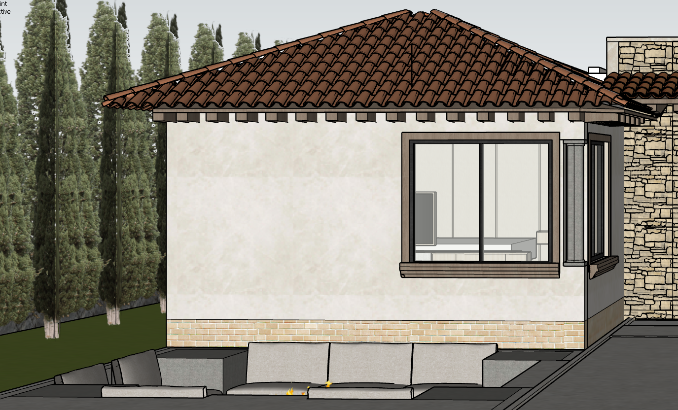 delightful mediterranean style house with a terracotta tiled roof in rich warm brown the exterior walls are a soft beige with subtle stone texture accented by a lower brick trim in light tan the large window frames are a deep earthy brown offering a glimpse into a minimalist white interior nestled in a serene green landscape the tall cypress trees in lush deep green add elegance a cozy sunken seating area features modern gray cushions with a subtle hint of warmth from a small fire feature the setting exudes a tranquil and inviting atmosphere during a golden hour capturing the warmth of the evening sun