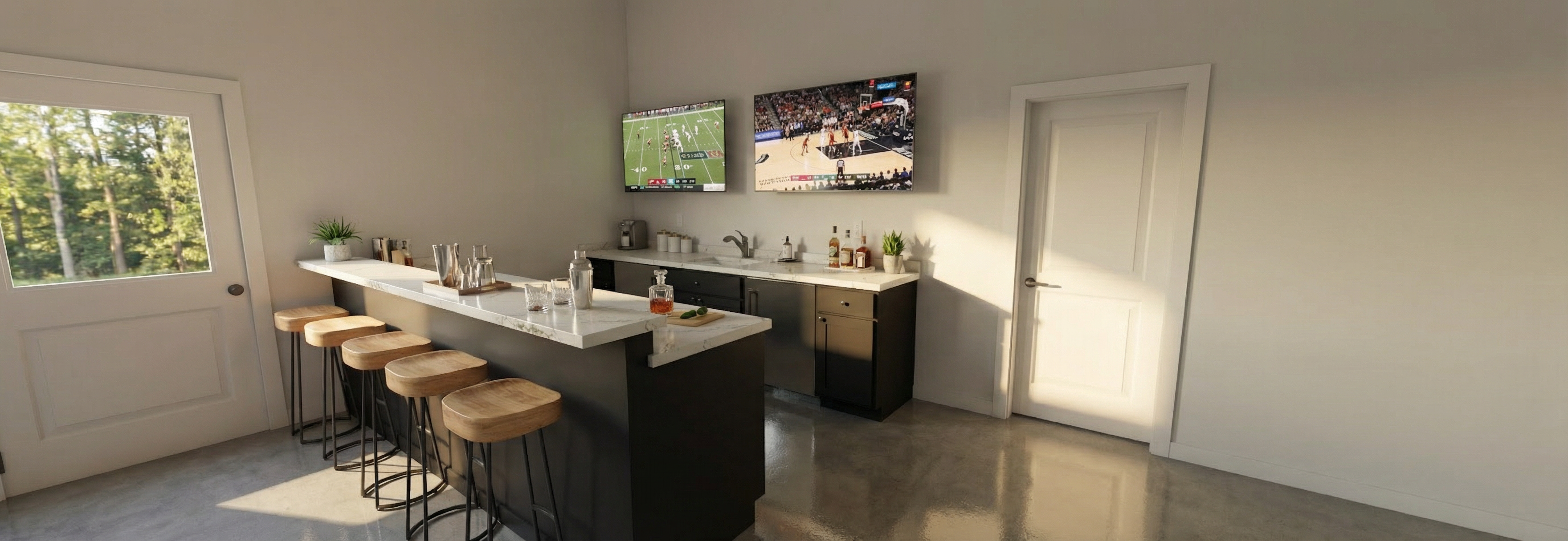 make realistic add decor make flooring epoxy concrete background with trees outside the glass put sports image on tvs