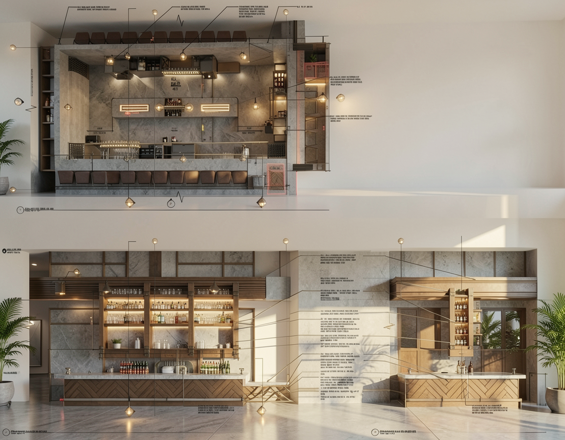 open plan kitchen and living room wider angle view white smooth walls with decorative wall molding panel frames white smooth ceiling with subtle rounded coving light oak hardwood floor center single wall kitchen with walnut wood lower cabinets matte gray greige upper cabinets beige cream textured tile backsplash black countertop black sink with black faucet built in black oven and cooktop small plant in white vase on countertop dark walnut oval dining table connected to kitchen counter as peninsula four black wishbone style chairs left wall tall dark gray charcoal built in wardrobe closet with black handles minimalist black wall clock above white paper lantern pendant lamps on the ceiling right side beige cream upholstered sofa with gray and brown cushions round oak nesting coffee tables with open magazine dark gray area rug two abstract geometric art prints in black frames on the wall above sofa black electrical outlets visible on backsplash warm natural daylight scandinavian minimalist style photorealistic interior photography