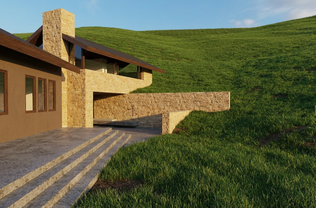 high desert landscape hillside with sagebrush brown drystack stone walls golden hour