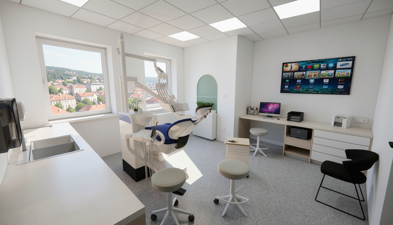 make a render tune the texture to realistic make the wiev to perspective make the view trought the window with a town panoramatic for nitra in slovakia to wiev of zobor change in the dental chair unit the metal round sink to white change on the 3 chairs delete the rings and make on the foots wheels meke the change correct delete one of the 3 same chairs delete that in the middle delete it better