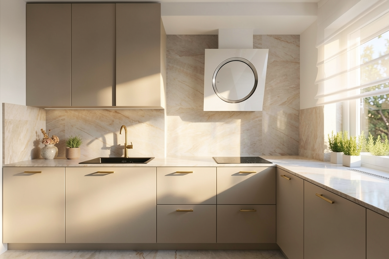 ultra photorealistic interior render of a contemporary luxury studio apartment entry corridor looking into the living area styled for real estate marketing camera positioned in the entry hallway eye level wide angle 24mm straight vertical lines professional architectural photography composition left side full height built in wardrobe cabinetry in warm light beige greige matte finish with clean flat panels and subtle vertical seams two long slim brushed brass vertical handles near the front edge elegant and minimal next to the wardrobe is a black metal framed glass partition door system with vertical mullions and clear glass crisp and modern keep the left wall clean flat and uncluttered floor glossy white marble tile with subtle beige veining in the entry polished reflective surface with realistic reflections floor transitions to warm natural oak wood planks in the living area center background sculptural brass framed vertical plant divider made of stacked oval loops floor to ceiling holding several planters with lush cascading green plants behind it an off white modern modular sofa with soft fabric upholstery a small round coffee table near the window floor to ceiling sheer curtains covering a large window right side a full height frameless mirror integrated into a flush sliding door panel no handle no visible track or hardware seamless minimalist surface mirror has physically accurate reflections showing the sofa plants and sunlight correctly lighting golden hour sunlight entering from the window warm soft light realistic bounce lighting high dynamic range soft plant shadows cast across the right wall and onto the mirror and floor recessed ceiling downlights visible but subtle natural exposure calm premium mood materials physically based materials realistic brass metal matte cabinetry clear glass polished marble reflections natural wood grain soft fabric texture on sofa crisp detail and sharp focus render quality ultra photorealistic ray tracing global illumination realistic reflections and shadows high detail textures professional real estate interior photography 8k