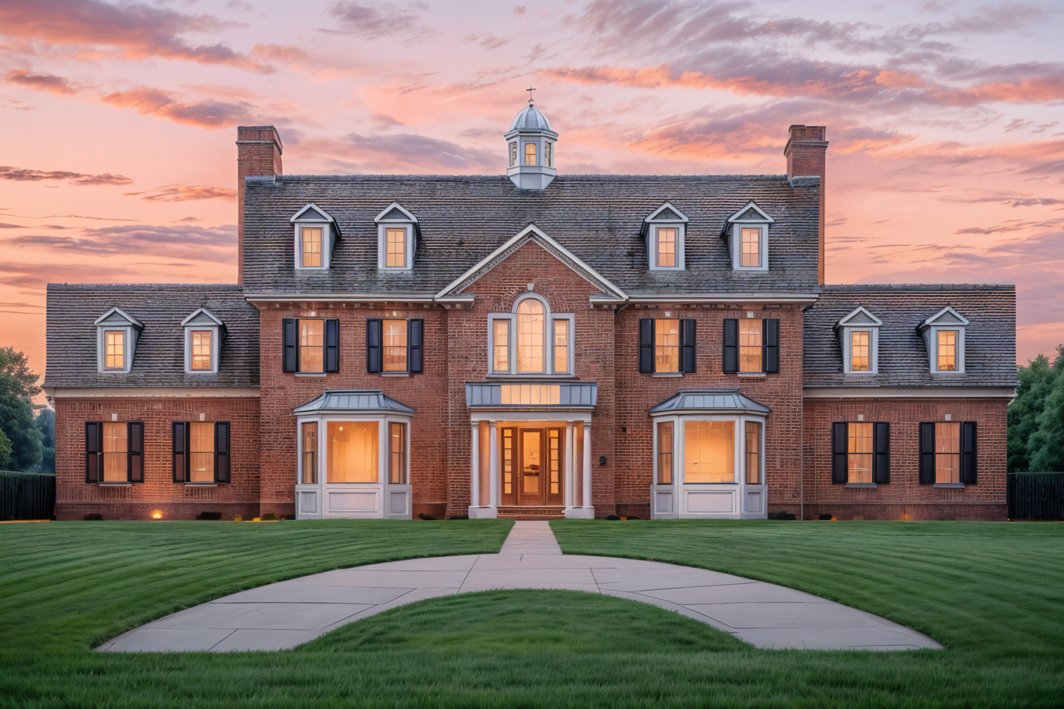 classical render a charming countryside home with a rustic yet modern design the main building is coated in a warm earthy gray with accents of medium brown and medium brown horizontal siding the roof is a standing seam metal charcoal gray the stone texture on the side panels is a mix of light grau and dark gray a warm inviting glow comes from the windows suggesting a cozy interior complemented by a soft sunset sky with hues of orange and pink surround the house with lush greenery tall trees in vibrant green and a path leading to the door with lavender bushes make the atmosphere serene and welcoming architecture
