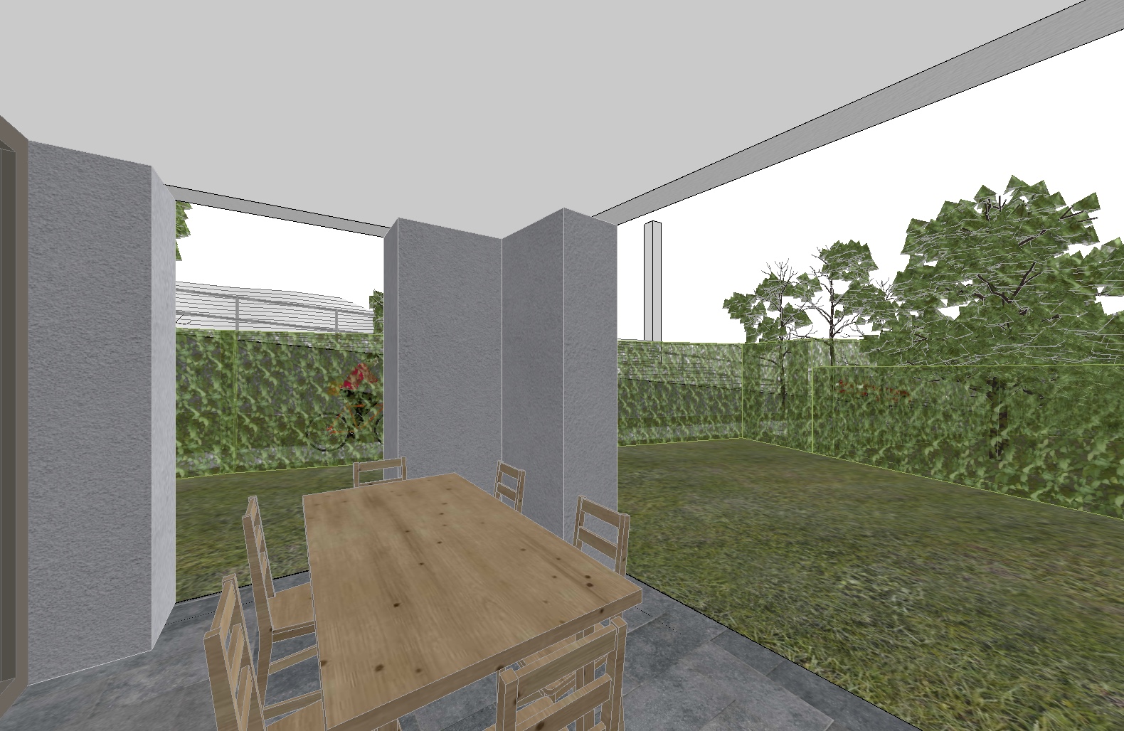 render a modern outdoor patio scene basking in the warm glow of a late mid day sun the atmosphere is serene and inviting with soft sharp sunlight casting gentle shadows across the scene elements walls textured light gray with subtle shadow play fence lush green ivy vibrant and healthy grass well manicured and deep green trees don t change the position of the trees and don t add further trees small mature and leafy providing additional depth with rich green foliage patio bluish gray stone tile flooring cool and elegant furniture natural oak wood table and chairs warm and inviting background don t add any buildings