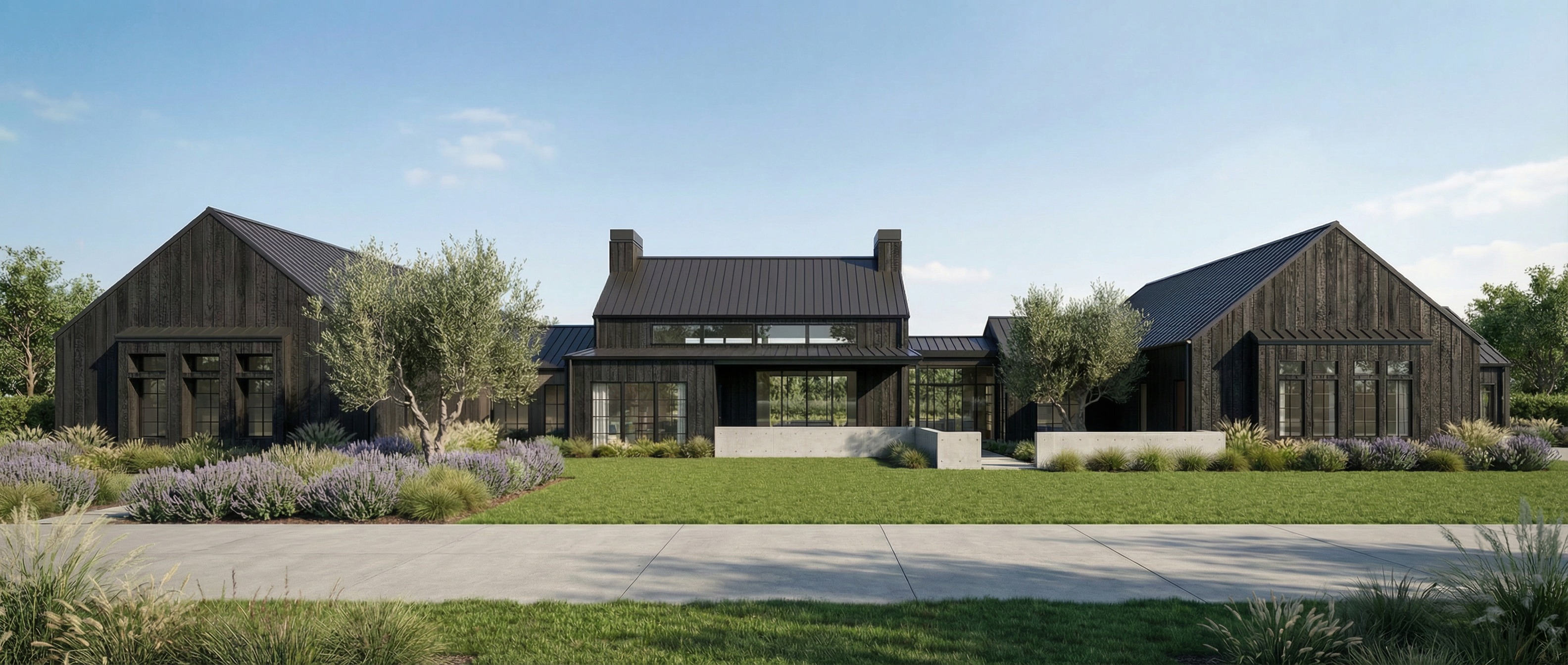 architectural exterior rendering of a luxurious sprawling custom modern home the entire exterior siding is matte black yakisugi shou sugi ban charred wood the roof is a charcoal black standing seam metal roof the house features a large open front courtyard the landscaping is mediterranean inspired featuring ancient gnarled olive trees with silvery green leaves vibrant purple lavender bushes and wispy ornamental grasses golden hour lighting photorealistic 8k resolution architectural photography hyper detailed