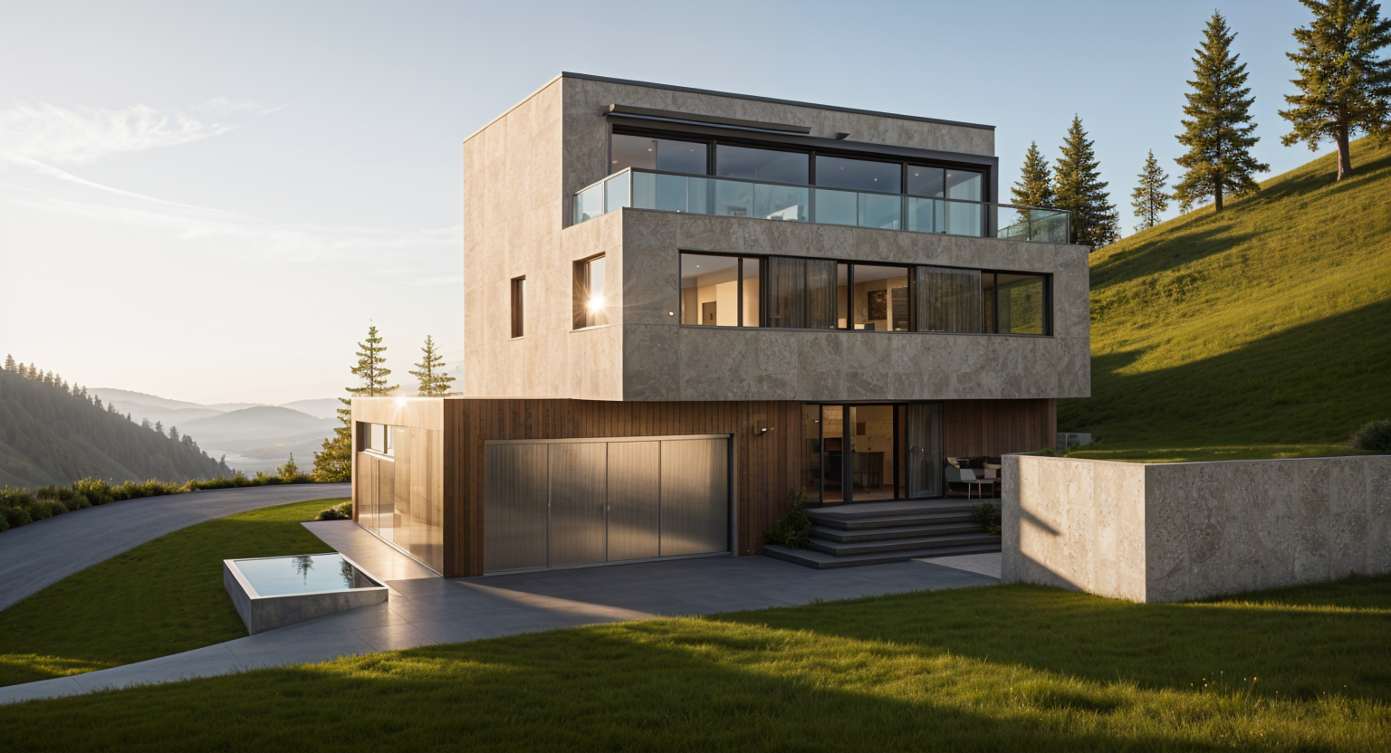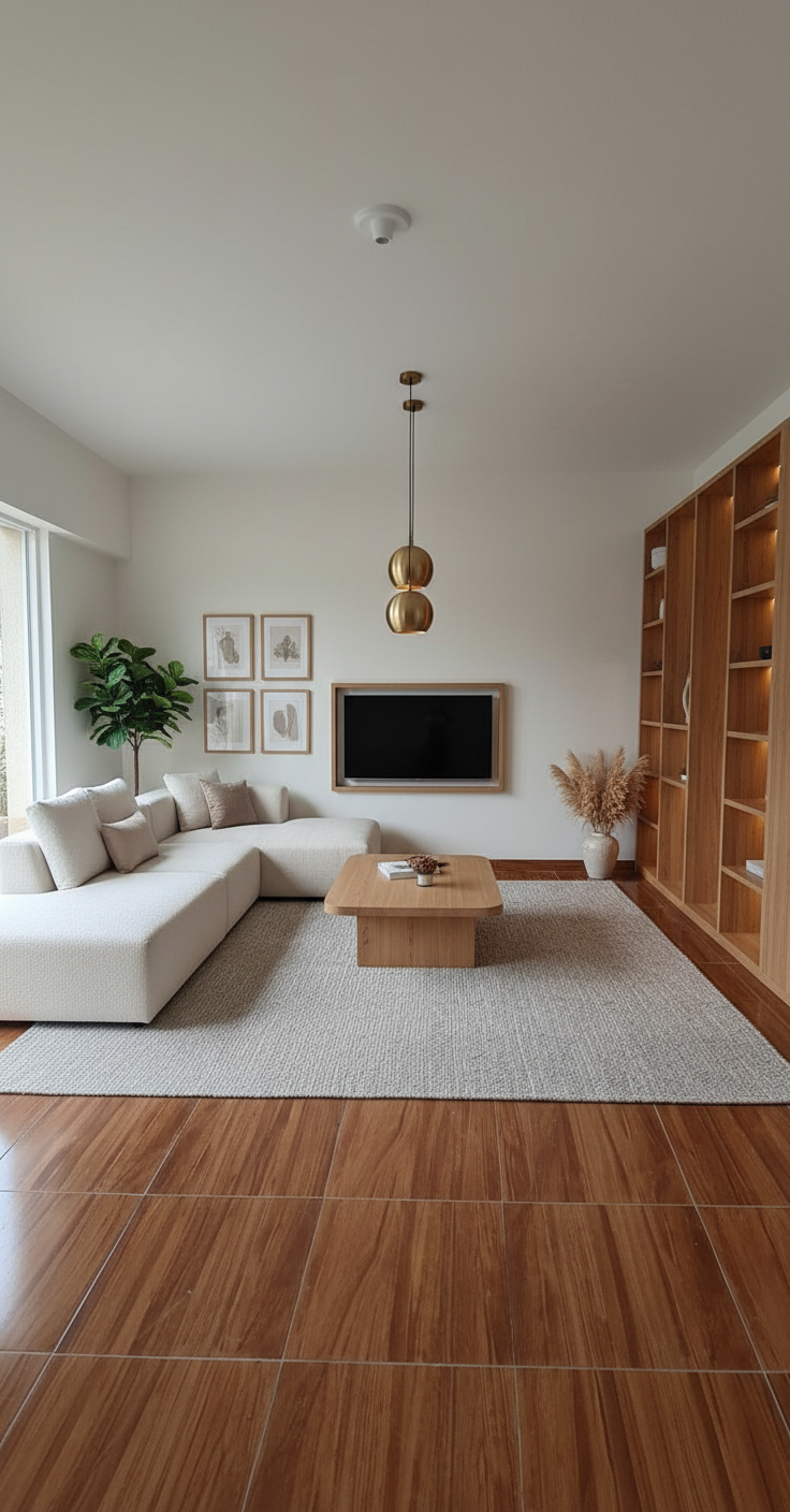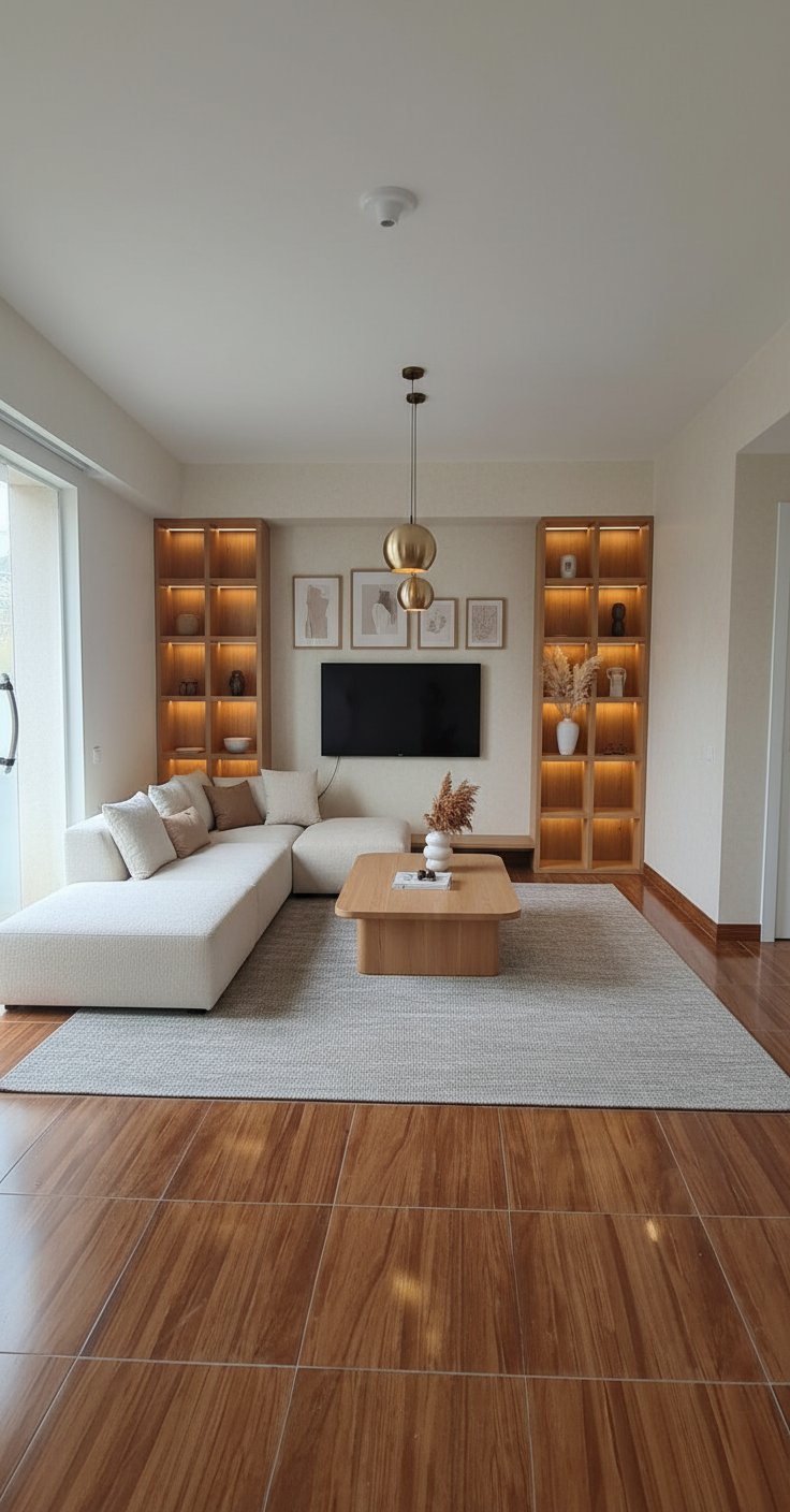 wide angle interior photography of a luxurious modern open plan living room 14mm lens ultra wide fov capturing the entire existing corner layout wall to wall with zero distortion of original architecture high ceiling preserved exact same tall frosted glass door on the left corner wall flooding soft natural daylight warm wooden cumaru style porcelain floor with glossy finish perfectly matching reference light cream painted walls with subtle texture l shaped modular sectional sofa far away from the tv wall in boucl off white with chaise longue on the right near from the shelf directed to the back wall where there is the tv large 3 2m x 1 8m natural oak coffee table with rounded edges 85 inch framed tv on the front wall with hidden cables built in oak shelving unit floor to ceiling on the right wall with led backlighting three pendant lights in brushed brass 40cm diameter above coffee table oversized woven wool rug in light gray 3 5m x 2 8m gallery wall with six framed abstract artworks in oak frames ceramic vase with dried pampas on the shelf linen throw pillows in cream and taupe minimalist scandinavian luxury palette in warm whites light grays natural oak and brass accents photorealistic 8k ultra hd razor sharp details professional architectural visualization serene and inviting atmosphere ar 3 2 stylize 150 v 6