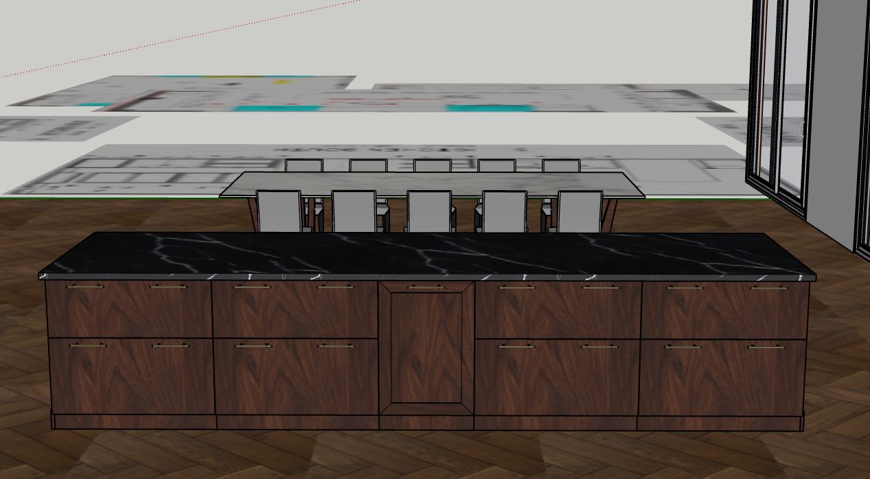 this is an island in a gorgeous kitchen with base cabinets made of a natural stained walnut all the cabinets have brushed brass handles the countertop is a beautiful black marble the floor is a beautiful hardwood the kitchen is flooded with natural light coming from windows and sliding glass sliding patio doors on the right out of frame