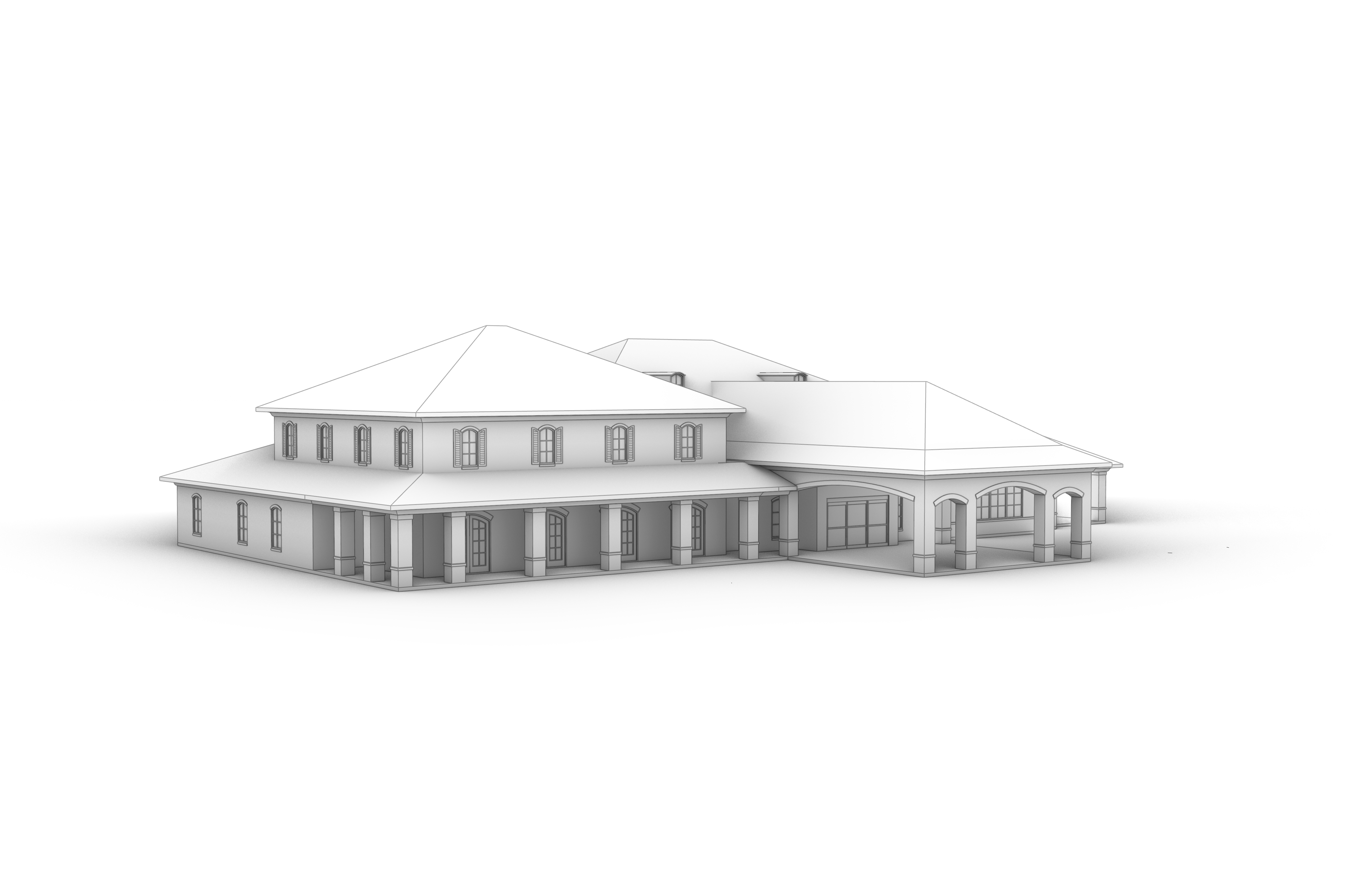 this is a funeral home in greenville sc make a realistic render the walls should be reddish brown brick the roof should be black shingles the columns should also be brick the trim should be painted white the front of the building should have landscaping found in south carolina there should be minimal paving for parking with access to the front carport