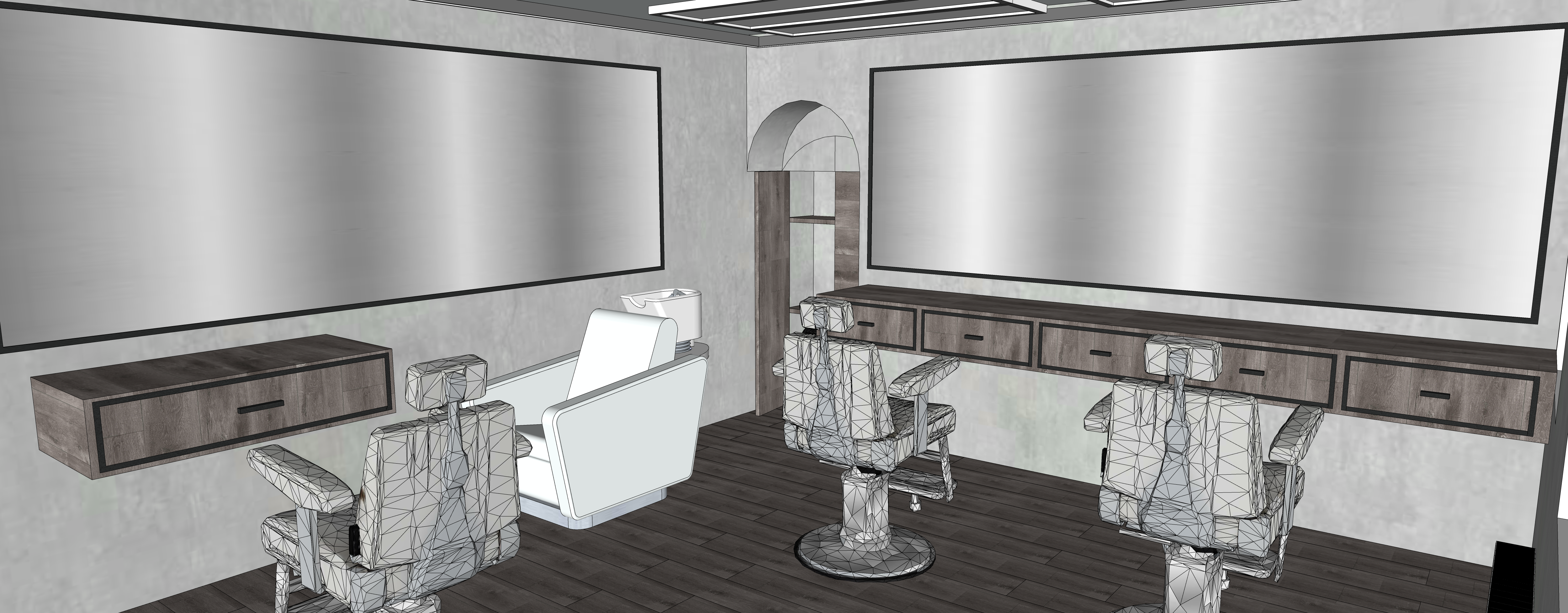 render a modern barbershop interior with a sleek sophisticated design the walls are a smooth finish light gray creating an industrial yet polished look the 3 barber chairs are upholstered in white leather with chrome accents in front of the chairs in the wall a 2 bigs mirrows with black square around it wooden flooring rich brown that adds warmth to the space the counter work is a dark wood add barber tools in the top of the counterwork for a touch of barber envairoment enhancing a fresh and inviting atmosphere ensure the lighting is soft providing a clean and contemporary vibe
