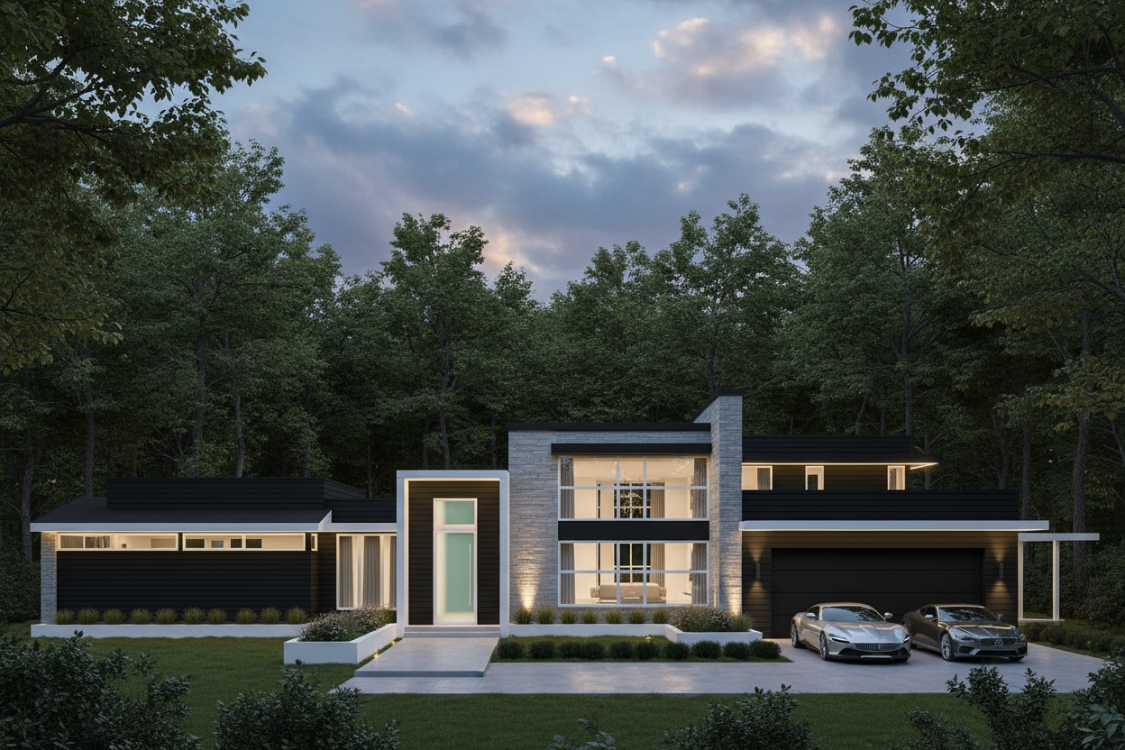 modern residential housing with traditional tiled roofs white plastered facades and a contemporary extension with flat roofs finished in smooth peach colored microcement the architecture features elegant arched windows flat roof terraces in peach colored microcement with light green surfaces and minimal black metal railings dark aluminum framed windows with large glass panels create strong contrast against the white walls the buildings are arranged on a sloped urban site with layered balconies courtyards and boundary walls minimalist mediterranean aesthetic soft natural daylight architectural visualization style clean linework realistic proportions neutral shadows high detail professional architectural rende