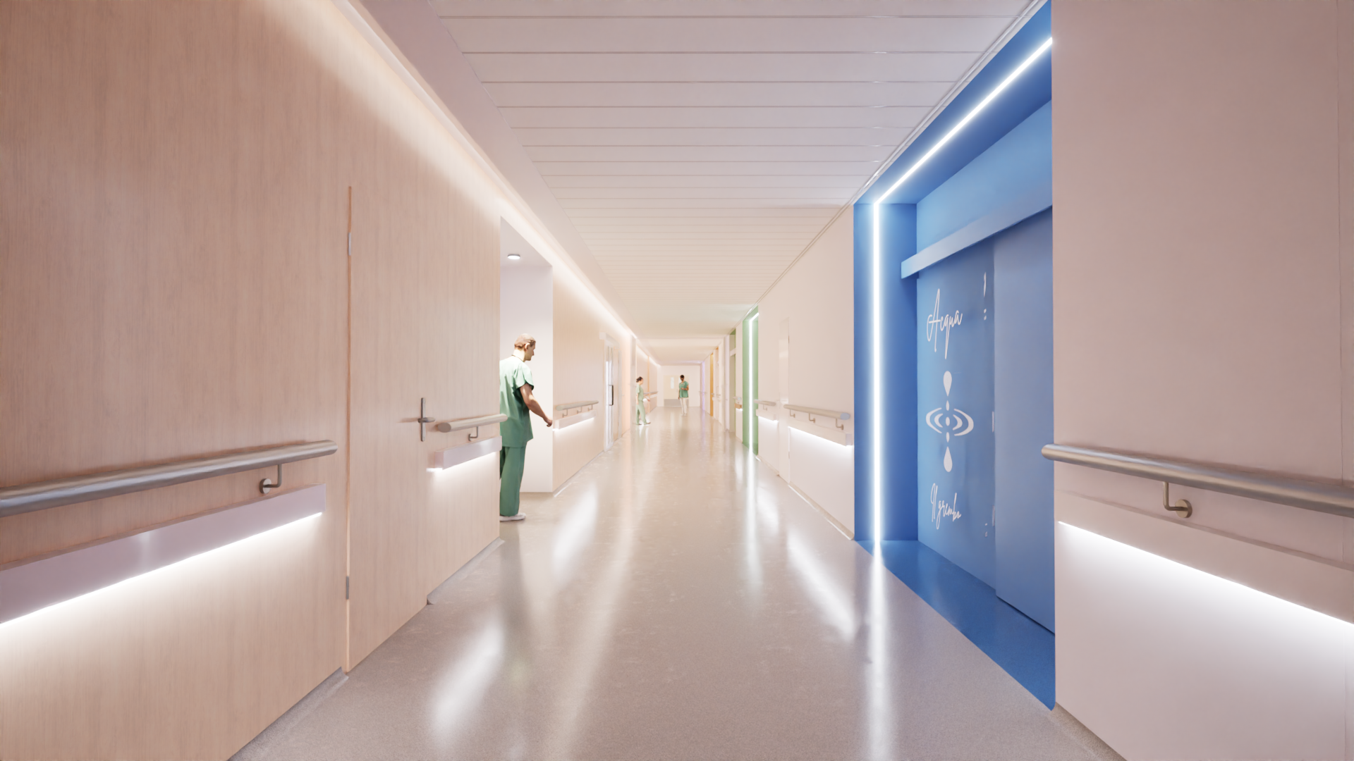 render a modern hospital hallway with soft white walls and light wood panel walls and a light gray ceiling illuminated by gentle led strip lights the floor is a polished light gray reflecting the warmth of the environment feature a striking blue wall on the right with subtle artistic motifs contrasted against the soft beige include staff in sea green scrubs to add a sense of care and professionalism the atmosphere is calm and serene evoking a sense of cleanliness and tranquility