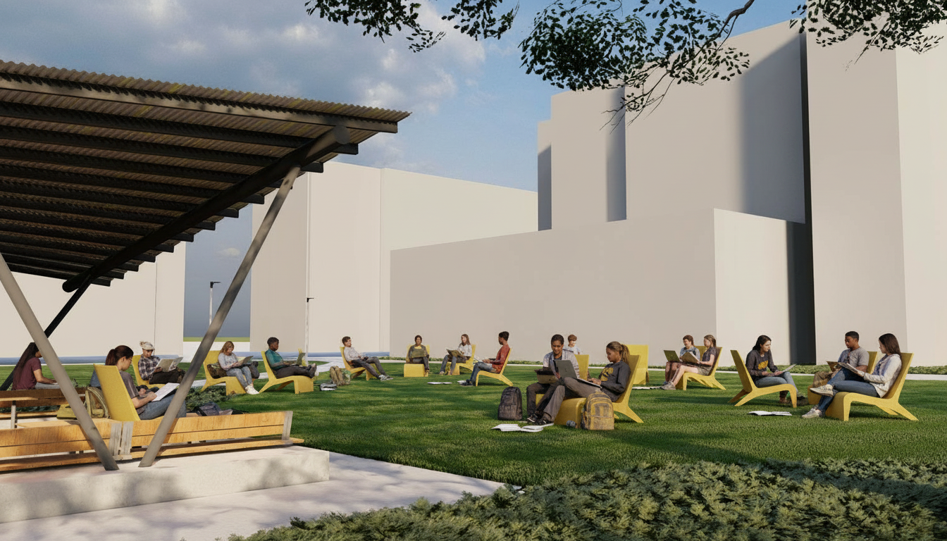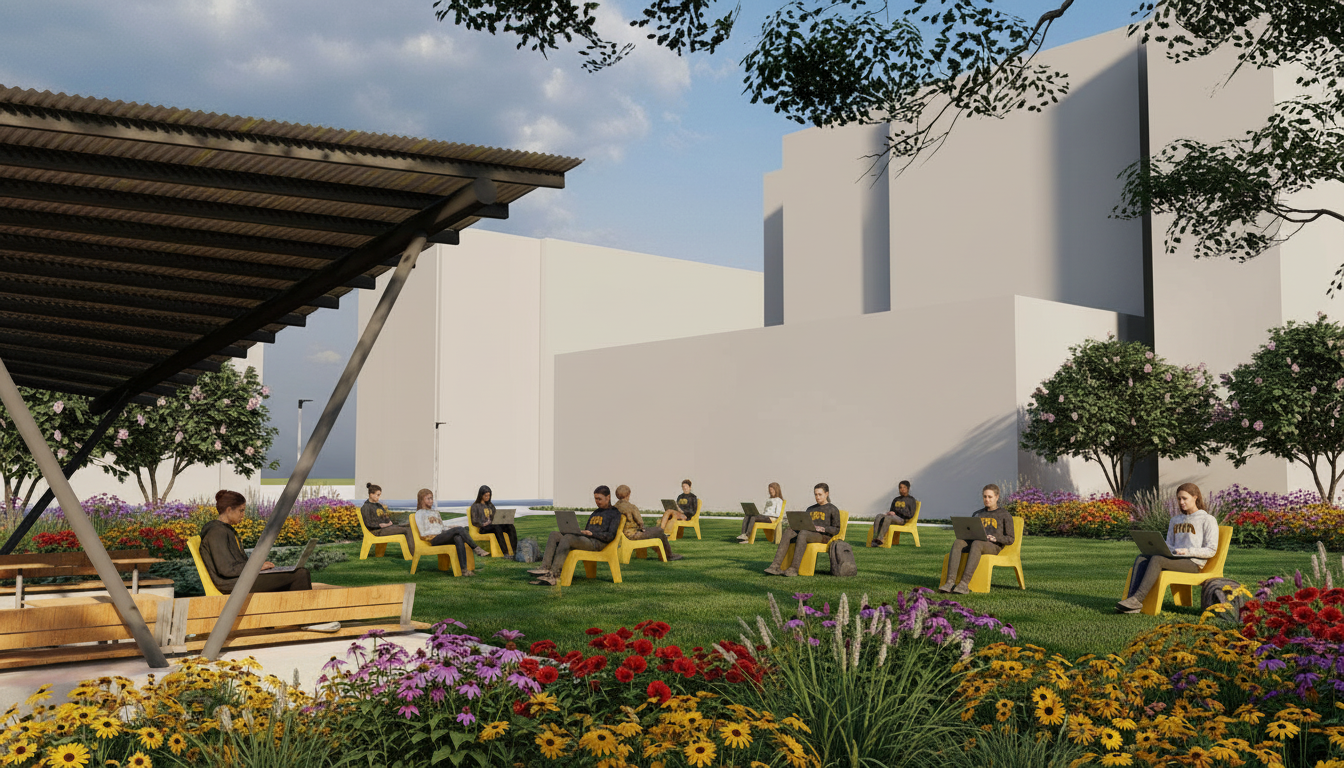 keep background the same in the lawn area add 15 yellow loll lounge chairs with university of iowa students