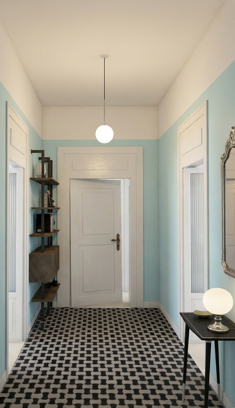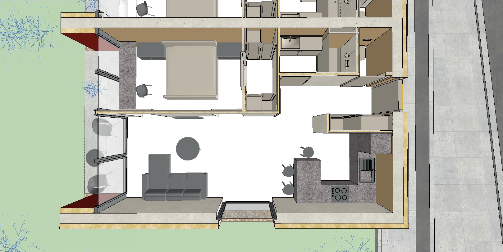render a beautiful modern apartment interior based on the provided floor plan use light warm colors to create a cozy and inviting atmosphere incorporate soft beige and cream tones for the walls elegant light oak flooring and white for the ceilings the furniture should embody a minimalist design with a scandinavian style featuring natural wood and pastel colored upholstery in soft blues and greens for the kitchen area use sleek matte white cabinets with stainless steel appliances the bathroom should have a spa like feel with light gray tiles and minimalistic fixtures add vibrant leafy green plants throughout the space for a touch of nature and freshness