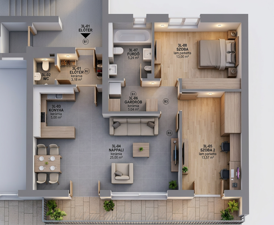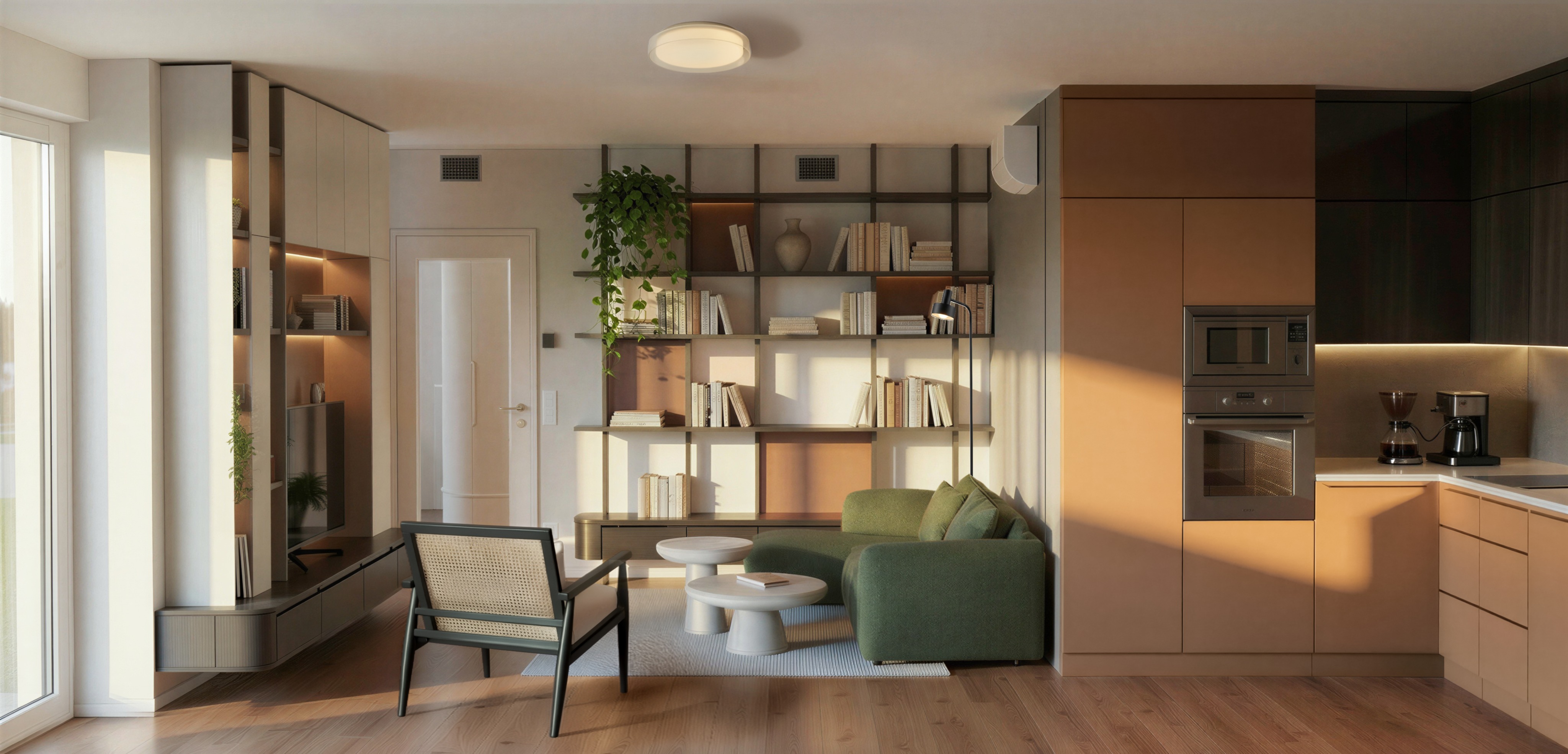 use the provided photorealistic render strictly as the base image maintain the exact composition camera angle lighting balance materials and all existing elements unless explicitly modified below task improve integration of the added lamp back right corner seamlessly integrate the existing inserted lamp located in the back right corner of the scene do not change the position size or design of the lamp only improve its realism and blending into the scene ensure physically accurate contact shadows where the lamp meets the floor and wall match the lamp s materials reflections and surface roughness to the scene s lighting conditions adjust color temperature and light intensity so the lamp emits a soft warm and subtle glow no overexposure the light should gently illuminate nearby surfaces wall floor surrounding objects with realistic falloff eliminate any visible compositing artifacts cutout edges mismatched noise sharp borders important constraints do not add any new objects do not modify any other furniture walls textures or lighting setup in the scene do not change global exposure or overall scene mood only locally adjust the lamp s contribution preserve the original render exactly outside of the lamp integration goal the lamp should look naturally part of the original render with believable lighting and subtle presence