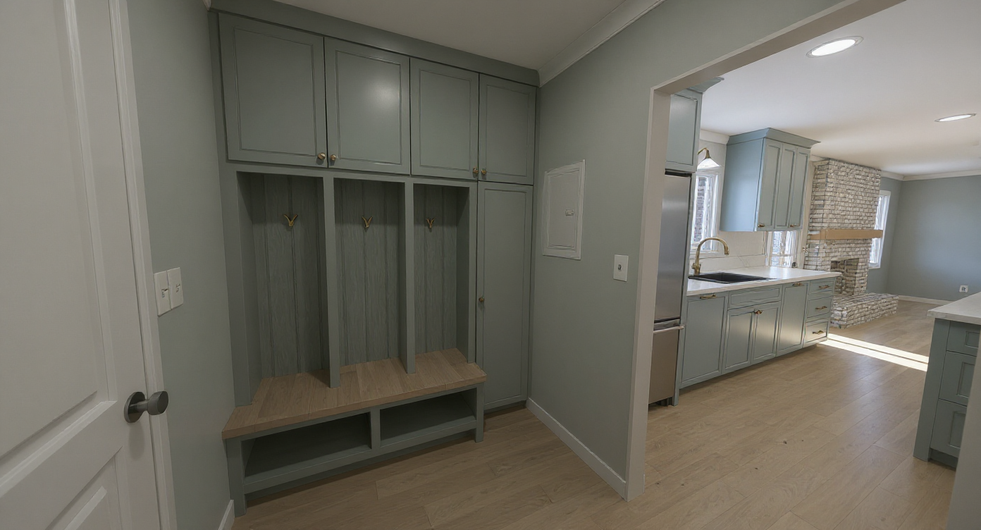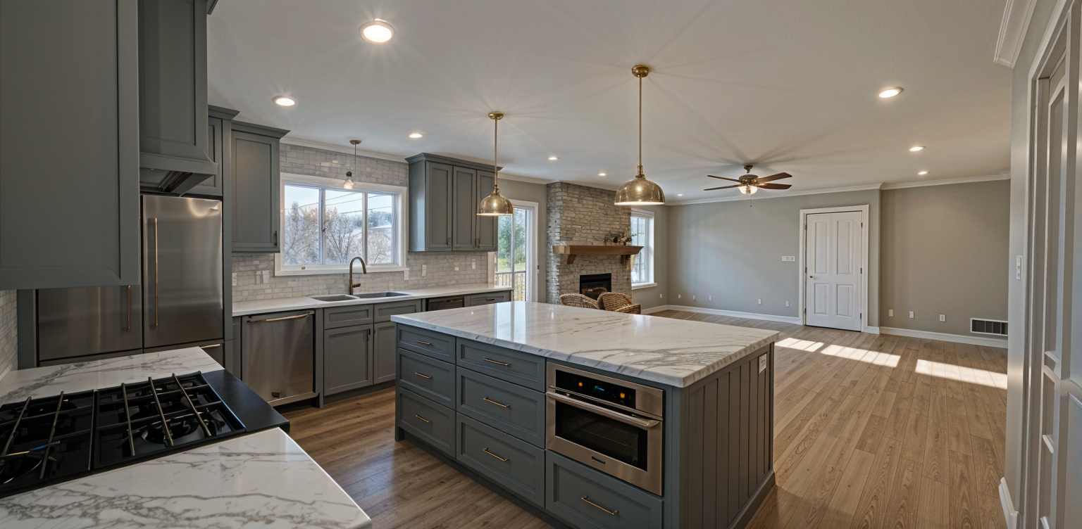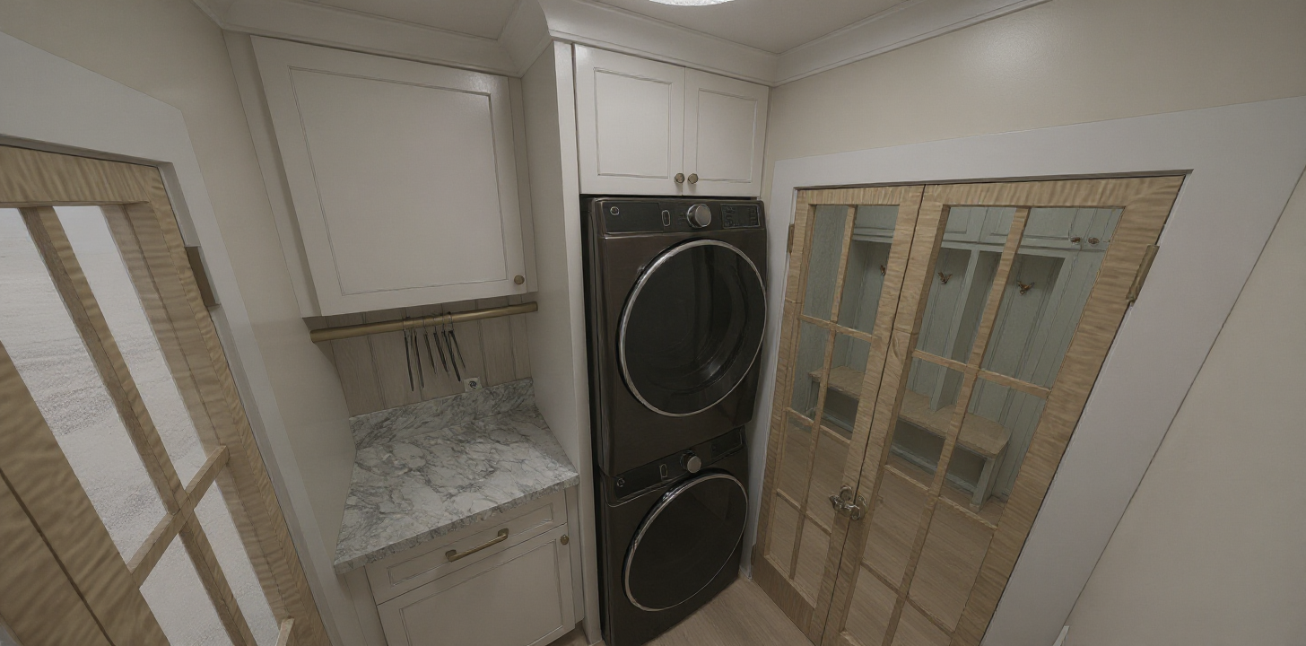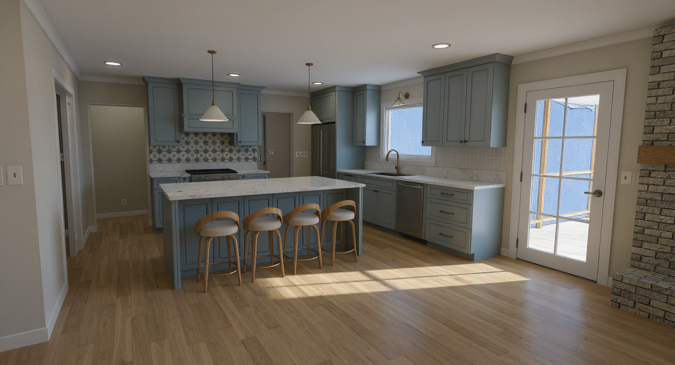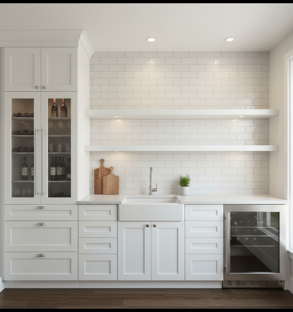 a photorealistic high resolution interior rendering of a modern farmhouse bar designed for architectural showcase retain all existing details white shaker cabinetry white painted shelves light gray quartz countertops moody artificial down lights natural wood flooring with dark stain emphasize realistic material textures subtle reflections on the countertops fine wood grain on the floors and soft matte paint finishes on cabinetry maintaining focus on the bars clean timeless design and craftsmanship with stainless steel appliances with glass doors