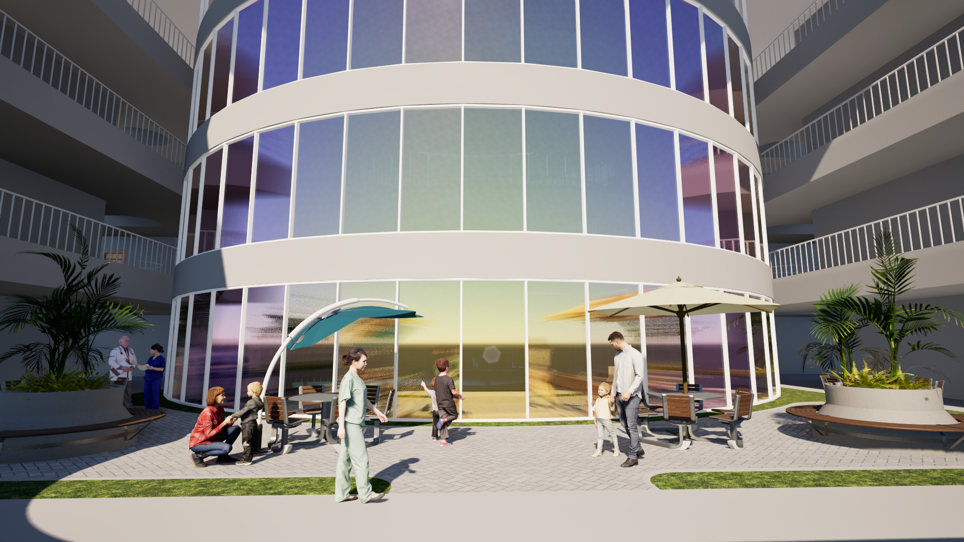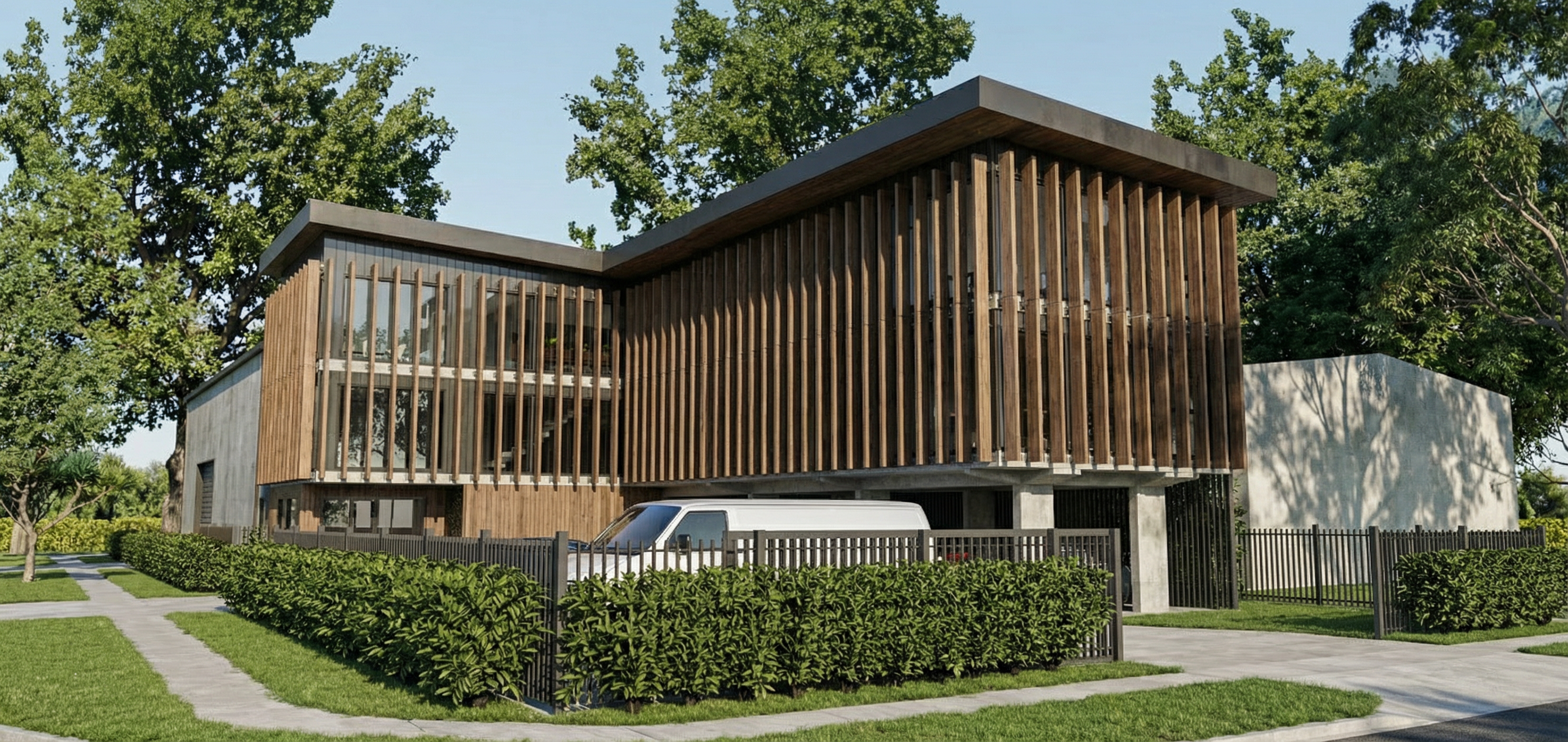 bauhaus exterior shot keep the characters and the polychrome glasses add low lying greneeries on the green area make it lively with colorful plants add materials on other parts of the photo architecture