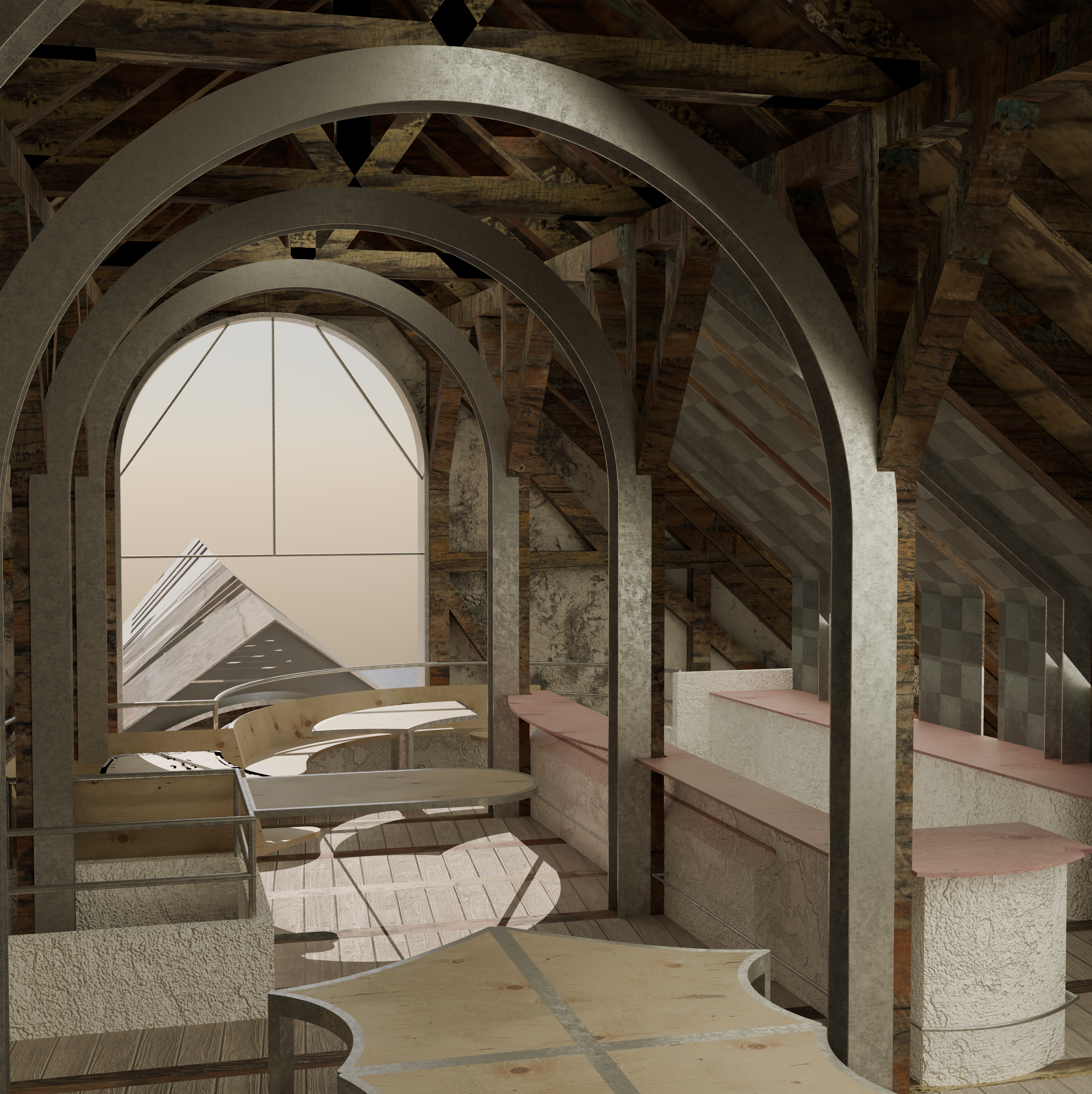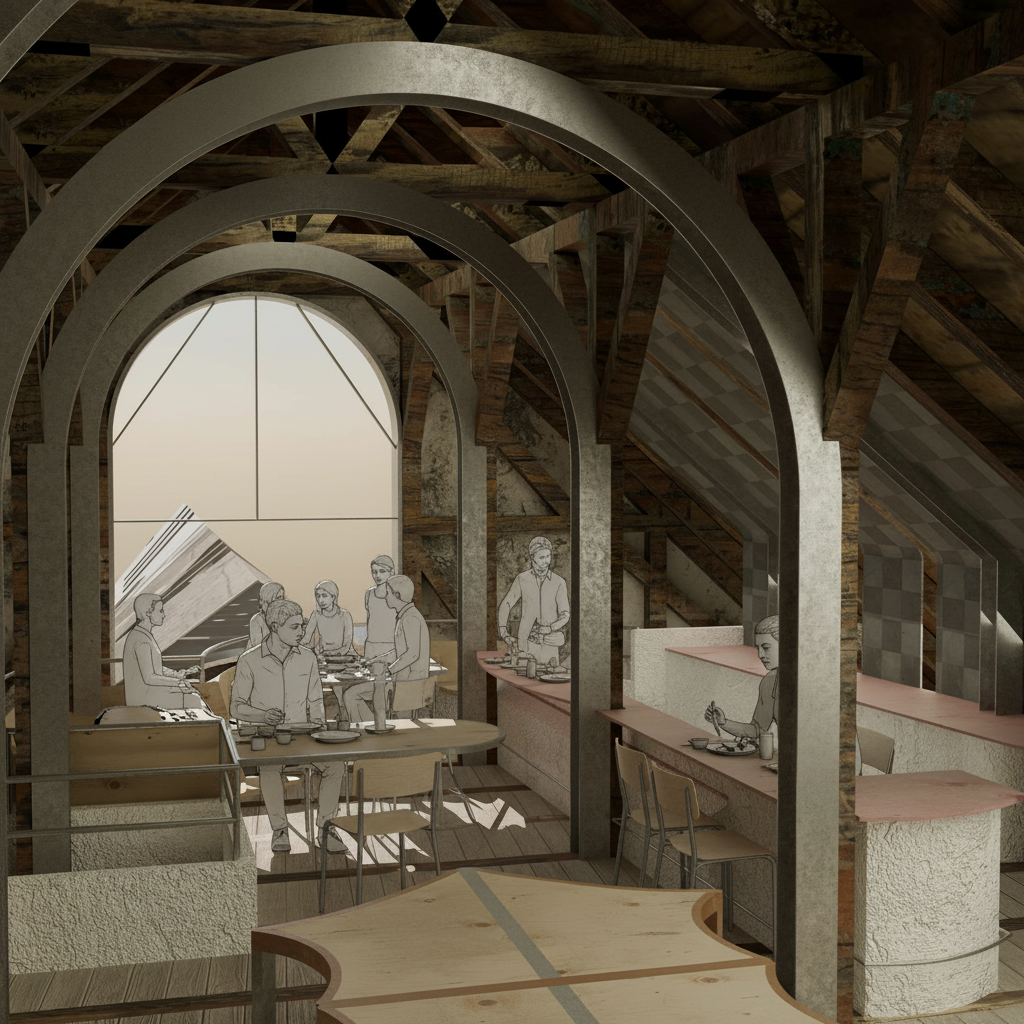 the wood construction black white outline architecture put people inside its a dining room right is the bar and on the left are the tables they should match the color the furniture should stay in color