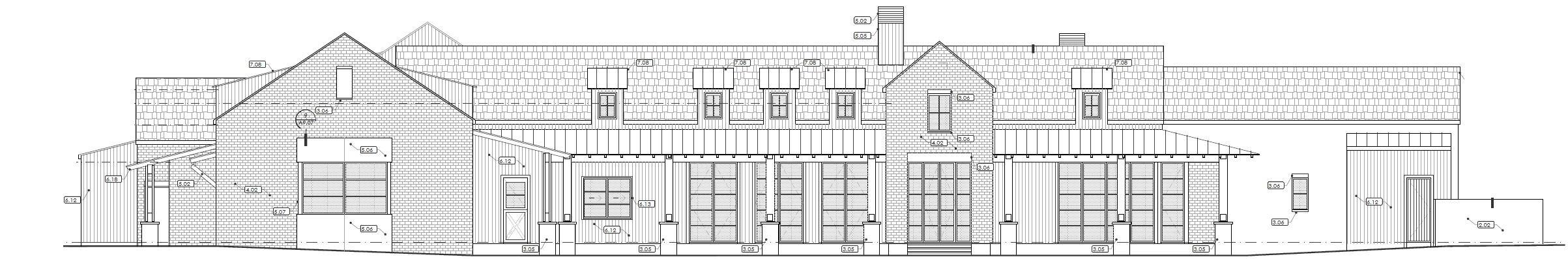 black roof red brick wood tone siding white paint in the forest