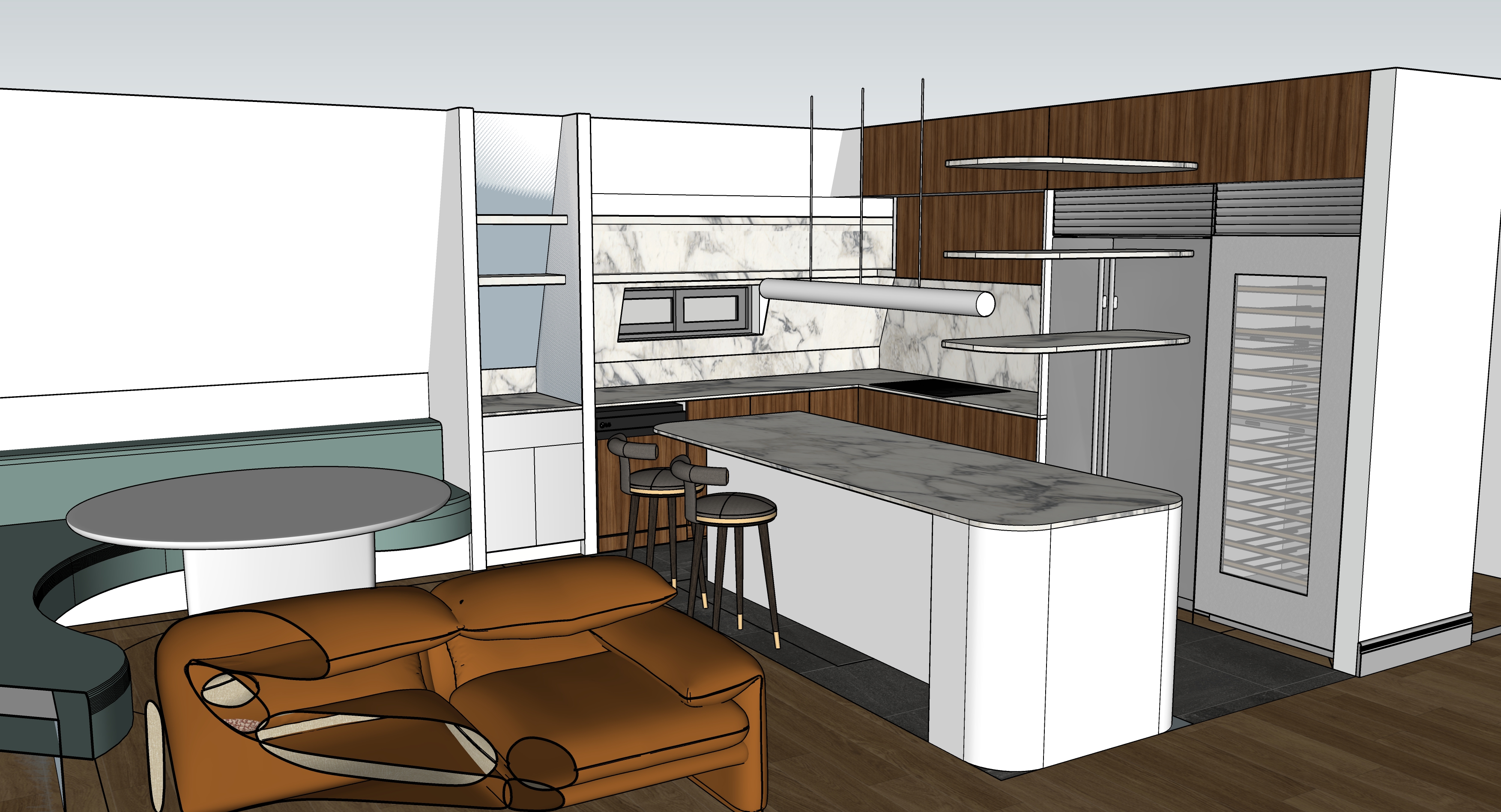 a luxurious and serene kitchen featuring walnut kitchen cabinet doors adorned with marble countertops accented by elegant brass hardware the atmosphere is calm and inviting with abundant natural light filtering through the window casting gentle shadows