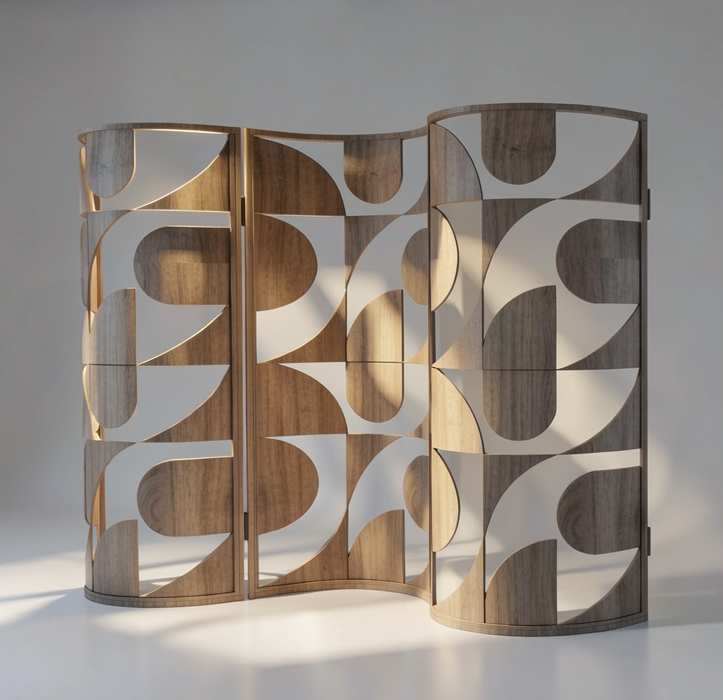 panel room divider modern design in light wood create a cozy and tranquil atmosphere with soft ambient lighting casting gentle shadows on a minimalistic light grey background