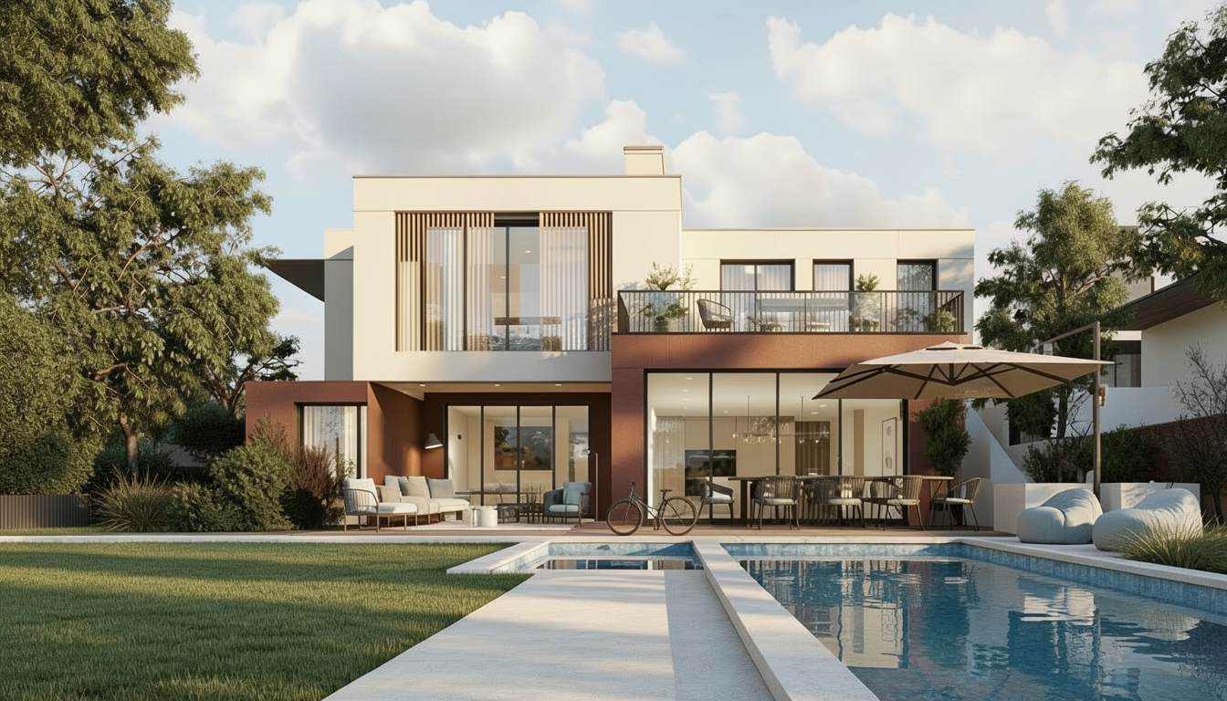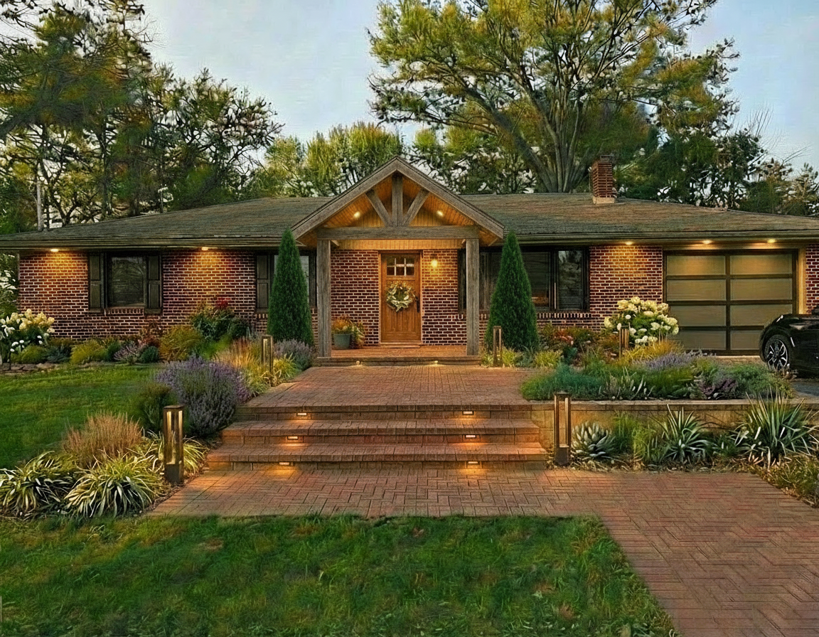 use this image as the base do not change the house lighting landscaping path or camera angle only adjust the two tall pine trees that flank the front entry make each pine slightly shorter in height trimming from the top only while keeping the same width fullness and overall shape no other elements in the scene should be altered do not make the trees wider fuller or thinner only reduce their height a little from the top