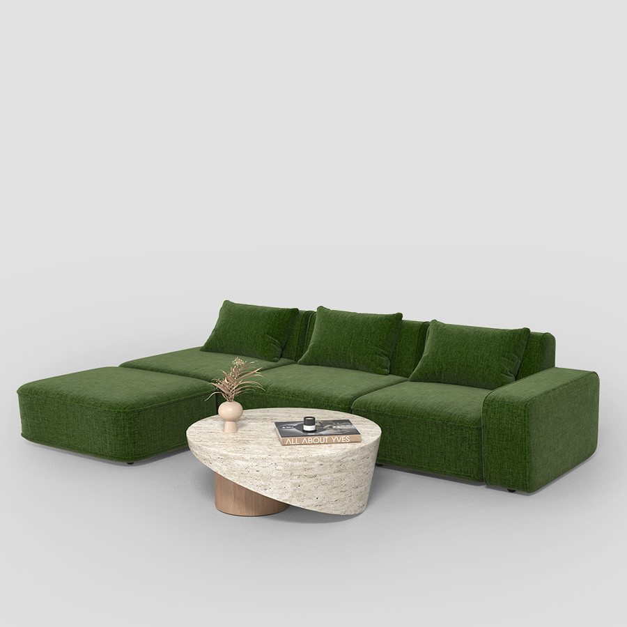 place this sofa in a room with a black smooth background not tiled make sure it takes up the entire back wall a dark wood floor and a concrete tall angled celing place a window on a wall so natural light comes in make sure the sofa is the main focus of the composition use colors and textures that go well with the sofas green color do not change anything absolutely anything about the sofa maintain the sofas texture position and color exactly the same add a modern lamp to the scene make sure the scene is unique make sure the room is big the sofa should not take up all of the space in the room