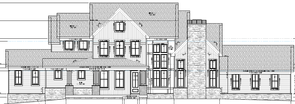 create a lifelike photo based on the architectural blueprint do not change anything structurally leave the house exactly as it is make the clapboard and board batten bright white for the veritcal composite siding make that a rustic oak black shingles paint the front door taupe black windows with vertical grille pattern natural stone in a chocolate gray color for the water table and column bases show a nice yard surrounding the home including mature trees landscaping etc