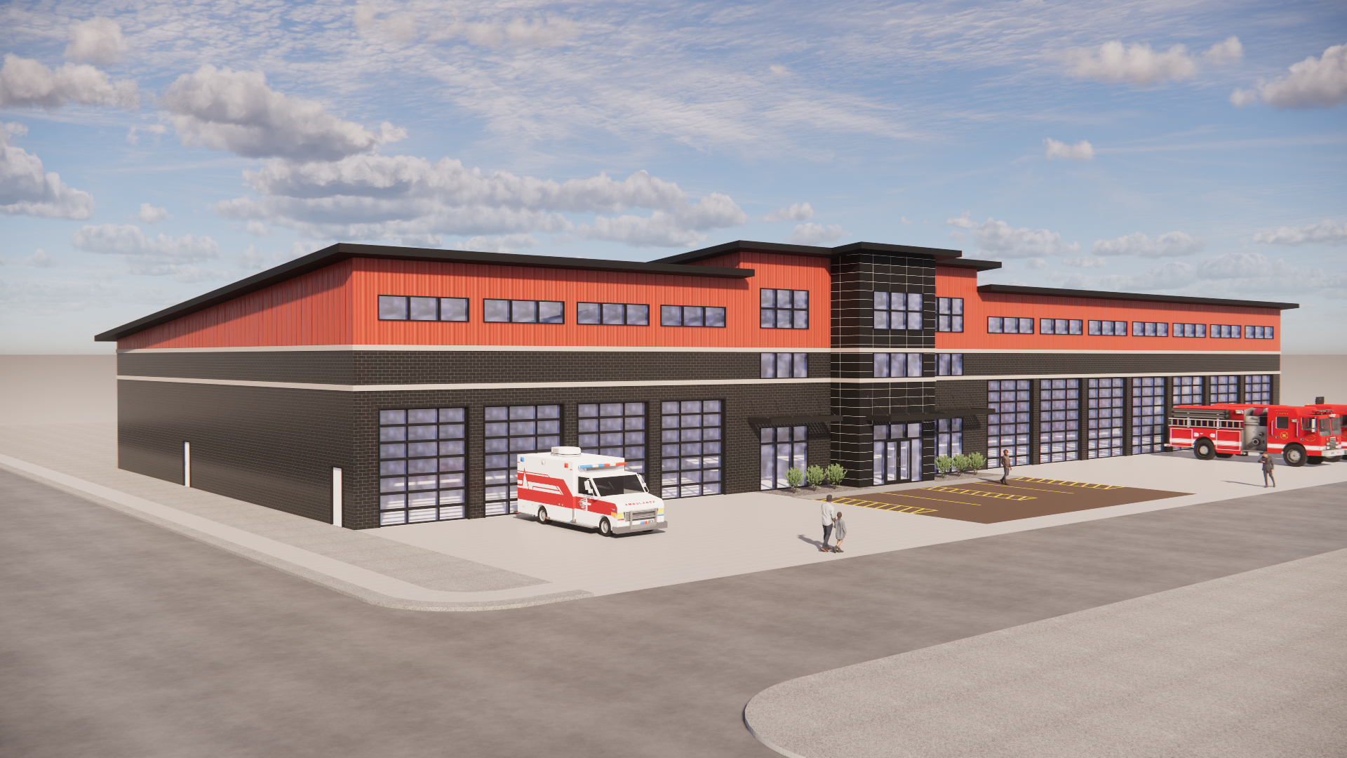 realistic rendering of a fire station don t change anything on the building keep windows doors colors materials everything as it s shown full glass garage doors as shown black brick with white grout where shown with tan band red metal siding on the top keep all windows as shown flat steel canopies where shown on the front don t add any more of them small buildings shops and homes in the background with a few trees