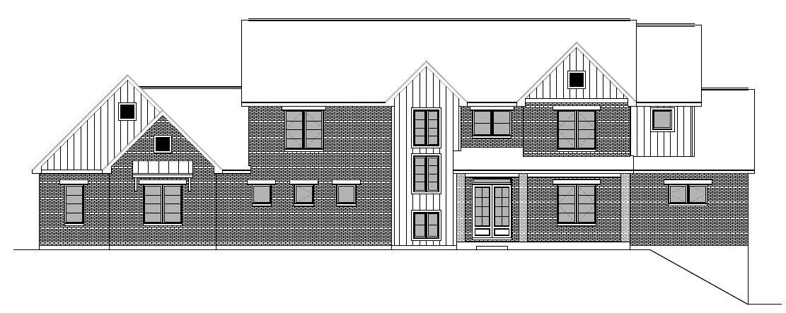 render a blue sky add trees and grass all brick hatch to be light grey brick all windows to have black trim and black mullions black facia trim make vertical hatch white board and baton siding the windows in the brick area to have brick rowlock above and below the windows
