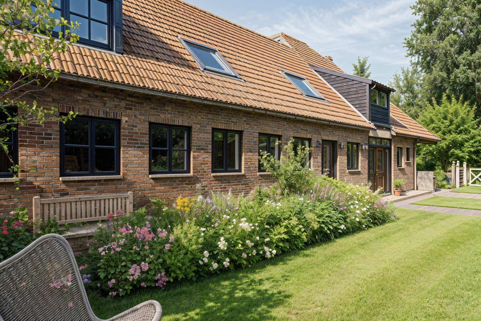 change the white window frames into black aluminum and make a square in each of them so 4 windows in each frame remove curtains and let daylight in also the windows have to be 3 bricks longer