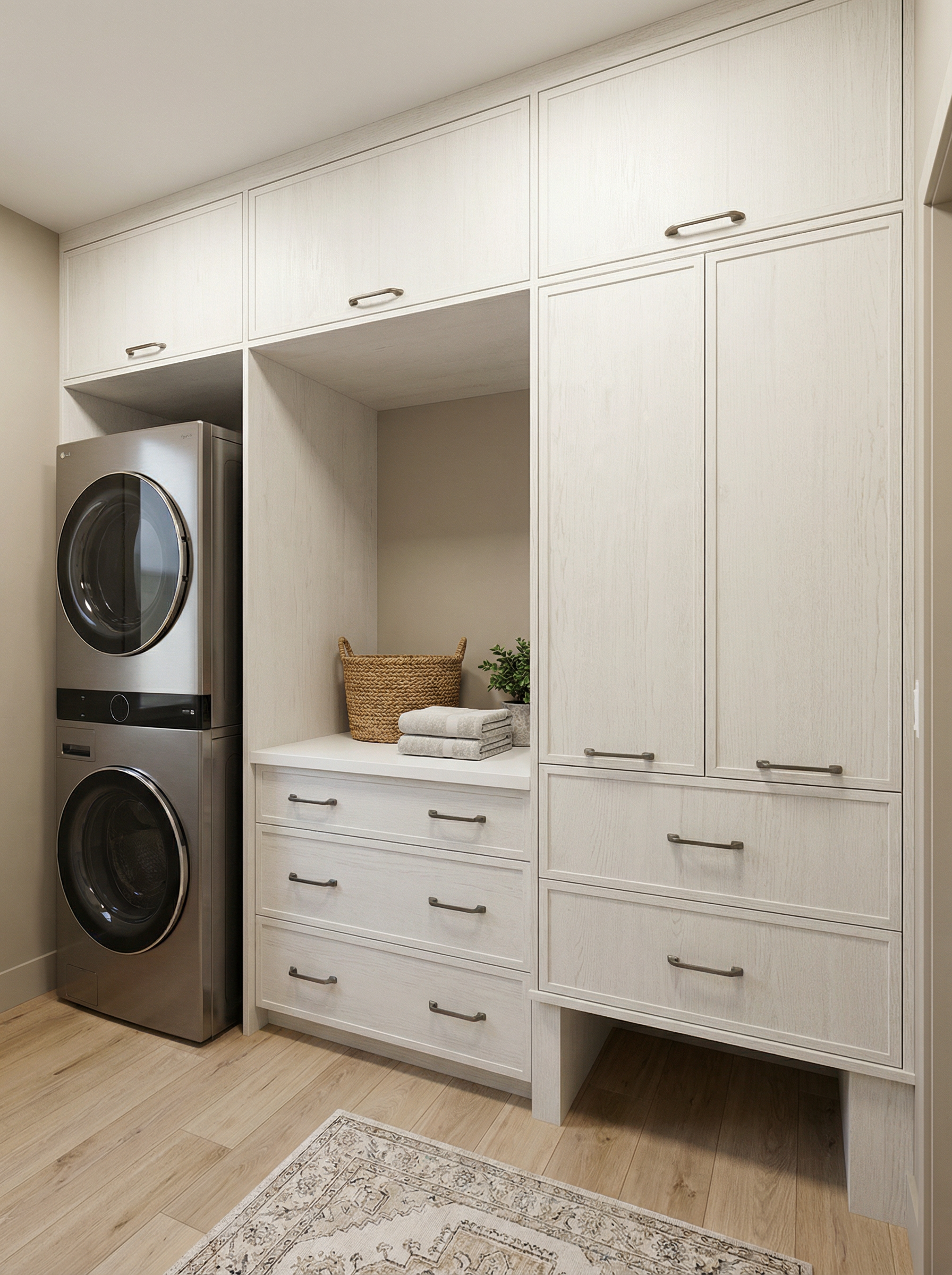 ceiling this is angled to peak the floors are a natural maple add brightness from the windows the door and window casing is white the railing is white the kitchen backsplash is granite like the countertops except where the hood is which is a copper mini subway tile the chairs don t have squiggle lines on them they are a brown pinstripe fabric with wood legs
