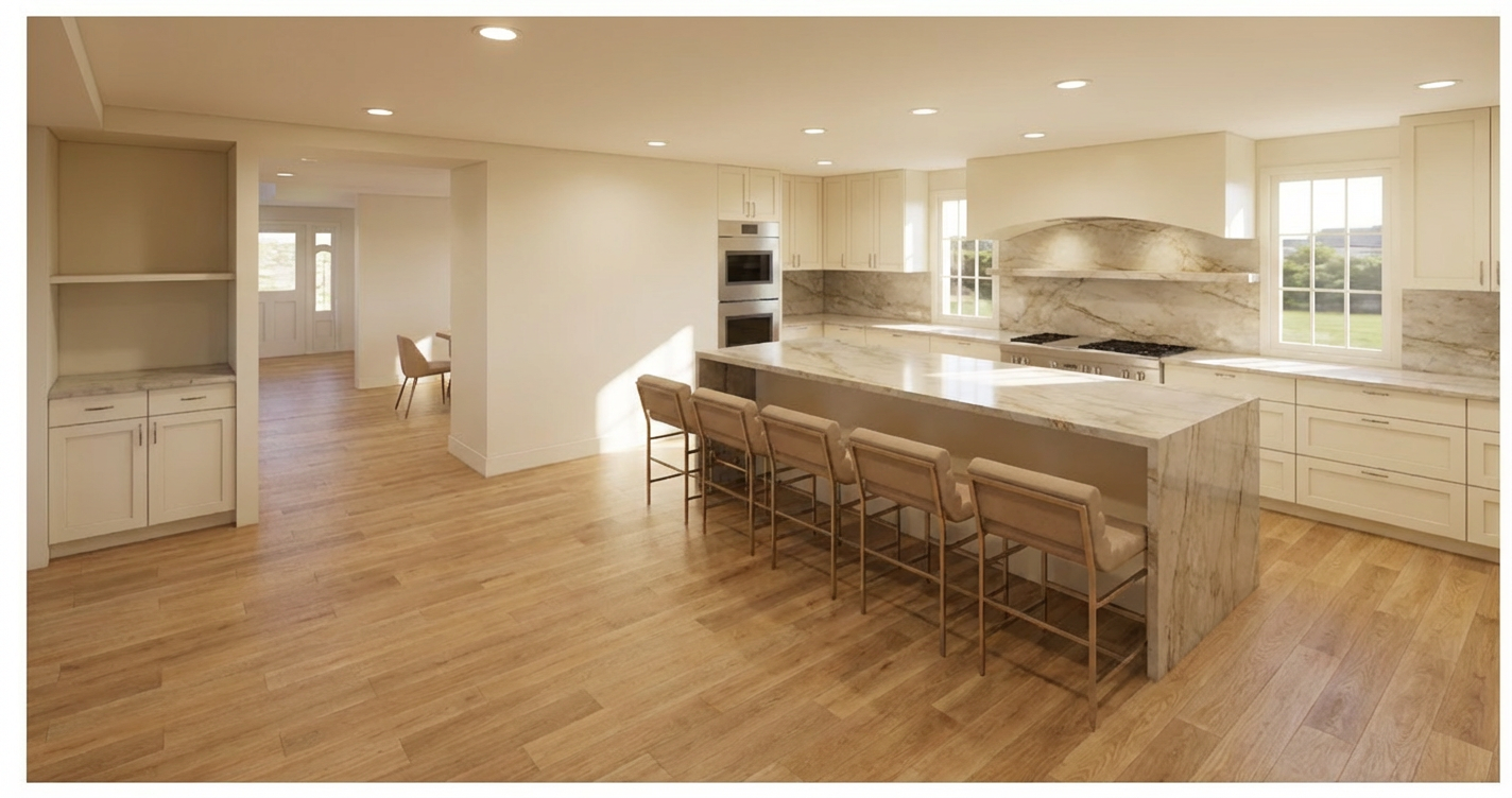 light oak door lighter micro cement walls white full height cabinetry