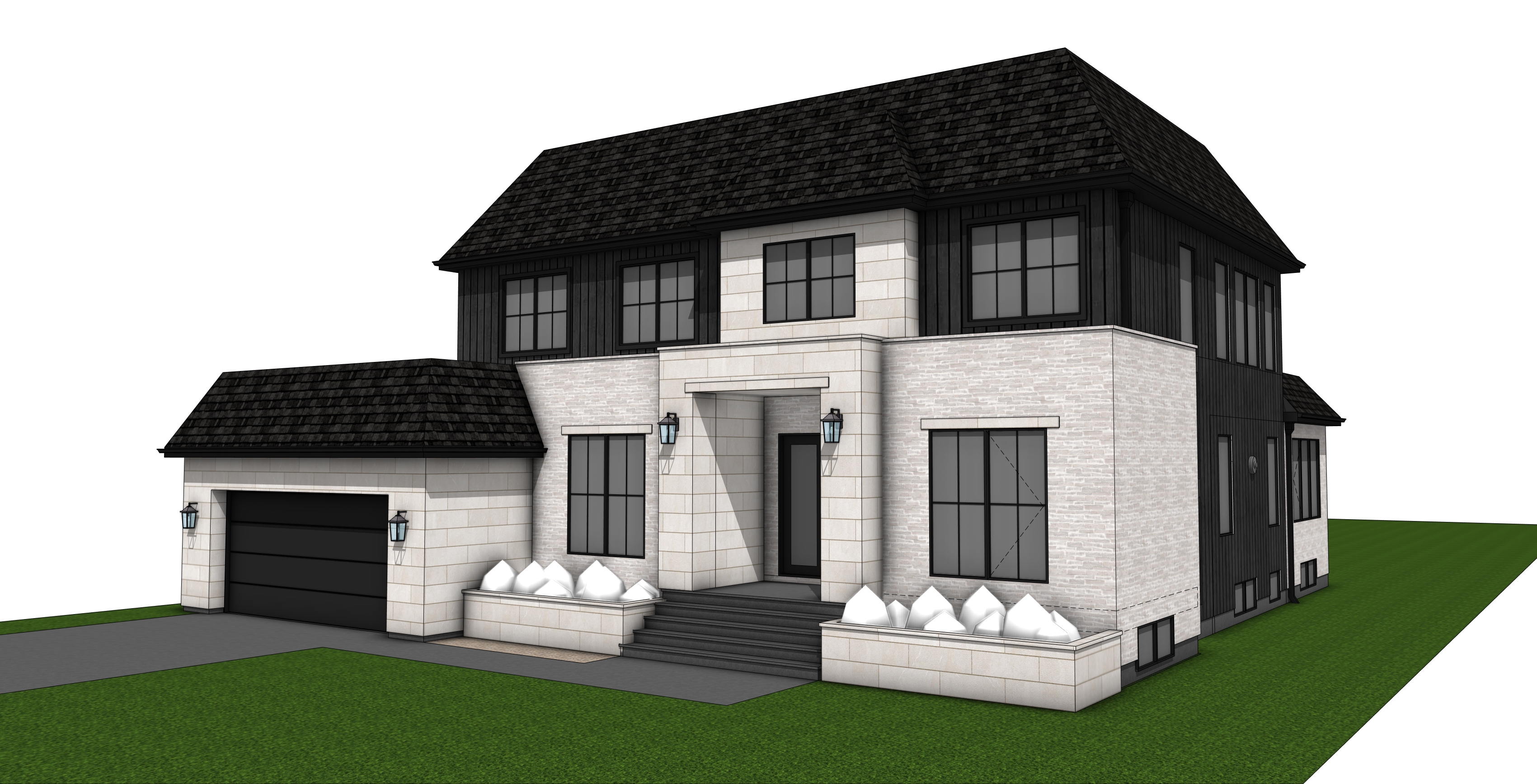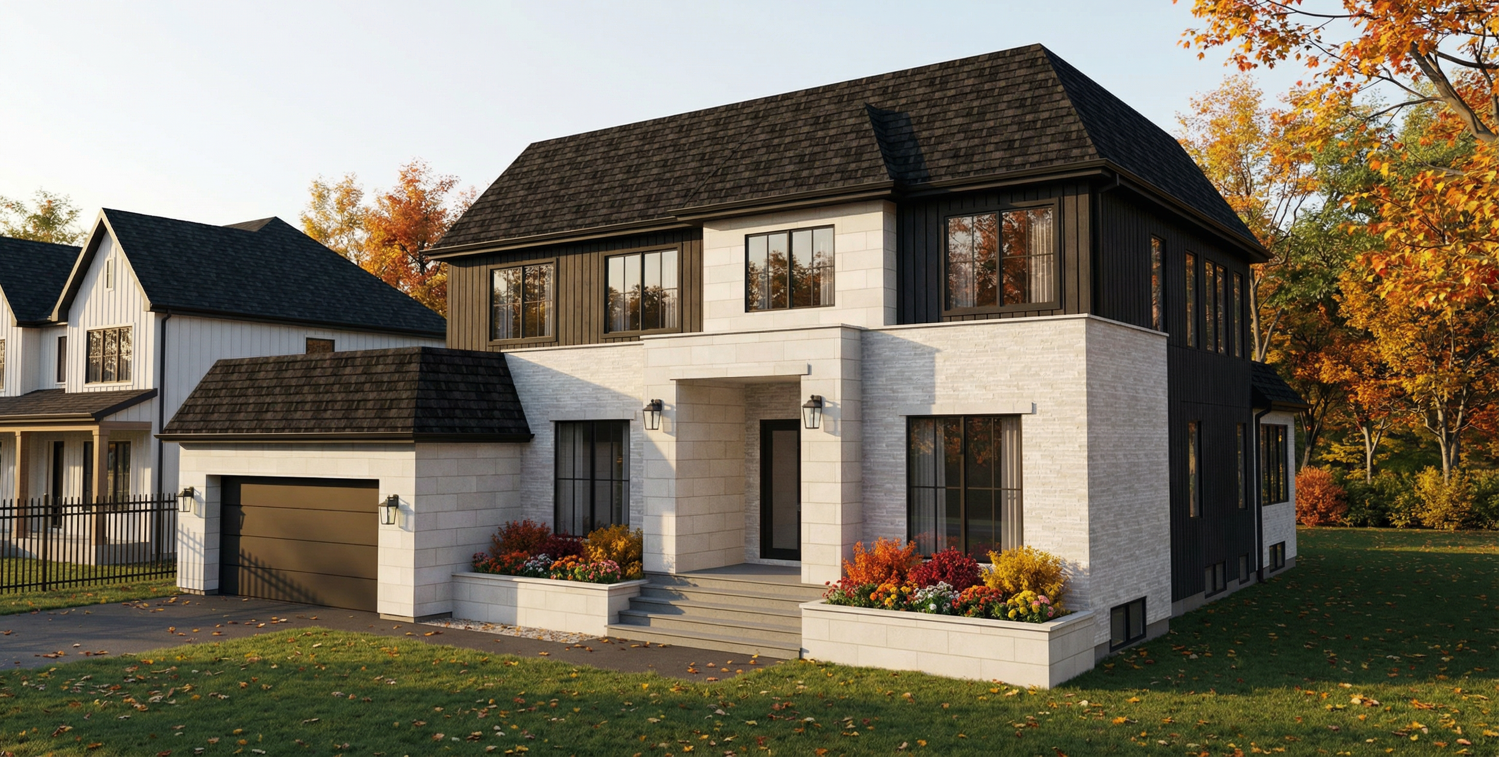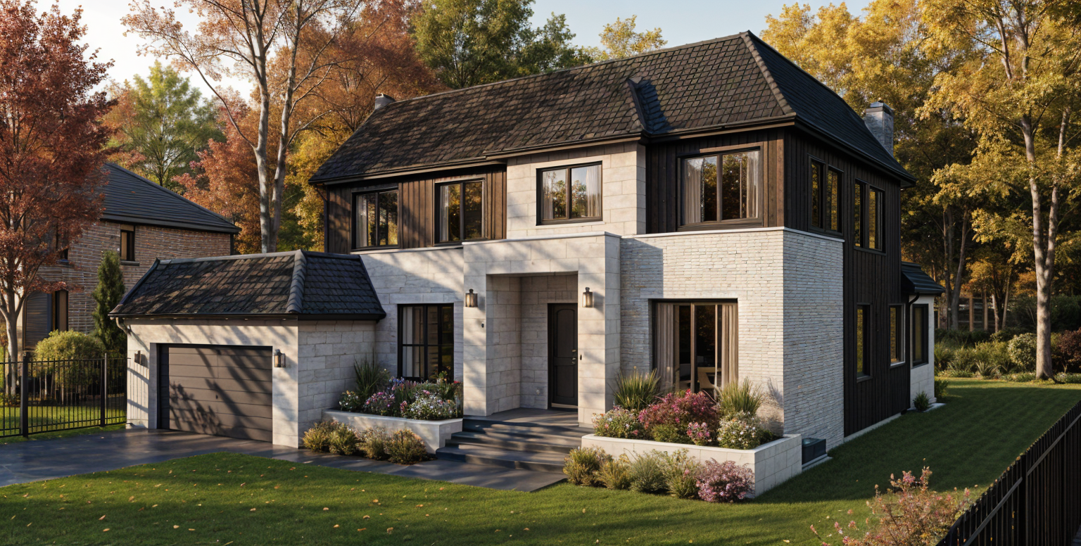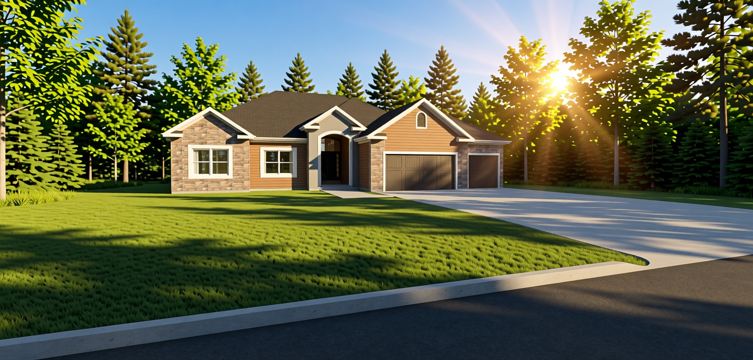 home is in a lightly wooded lot with one home about 30 feet away on the left the trees in the backyard are about 80 feet away there will be a metal picket fence 6 tall on the left hand side of the property the season is autmn so the trees along the rear and side will be somehat colourful there should be some subtle tasteful landscaping in the fron planters with low bushes and flowers ensure all windows and doors are rendered and not omitted