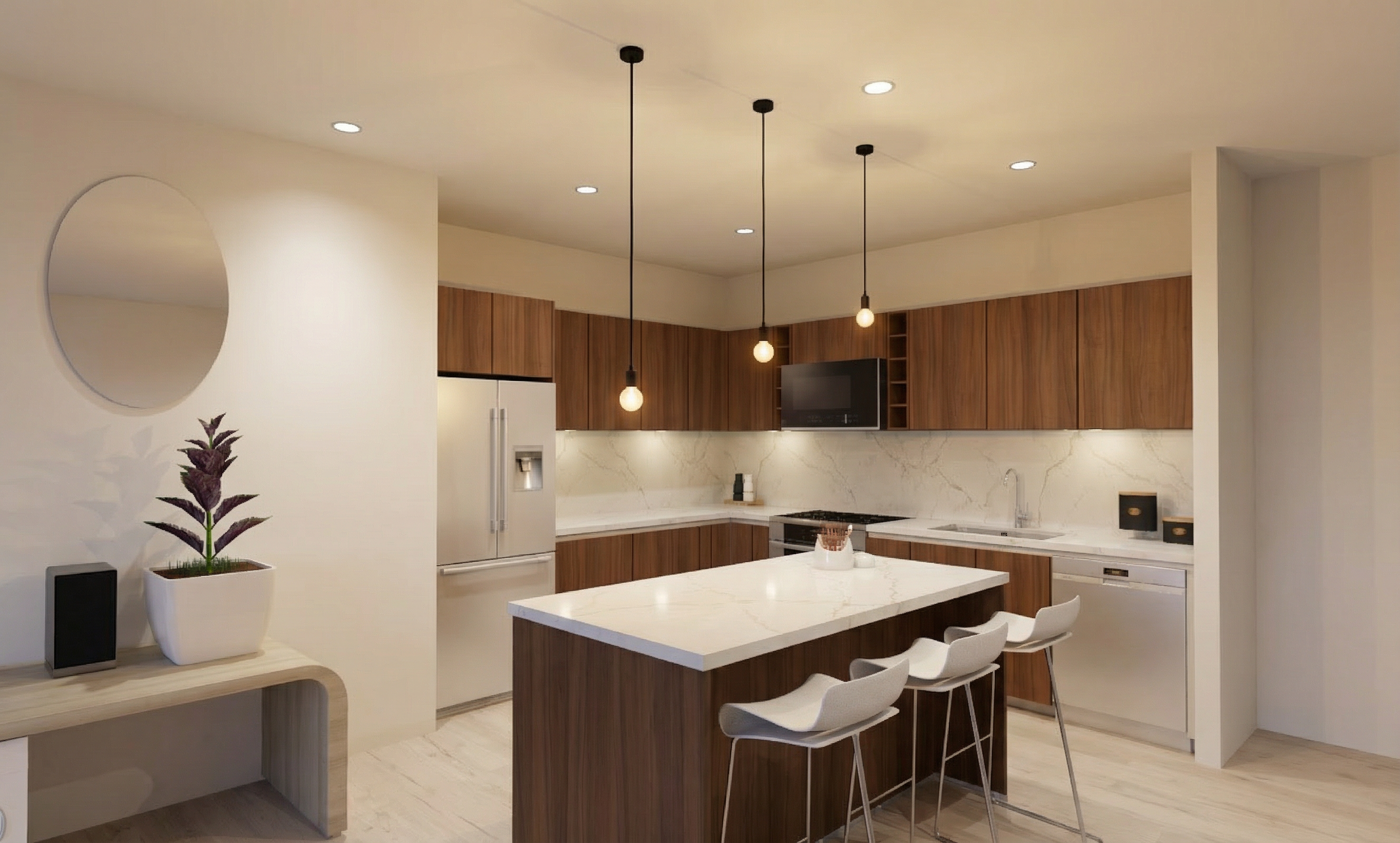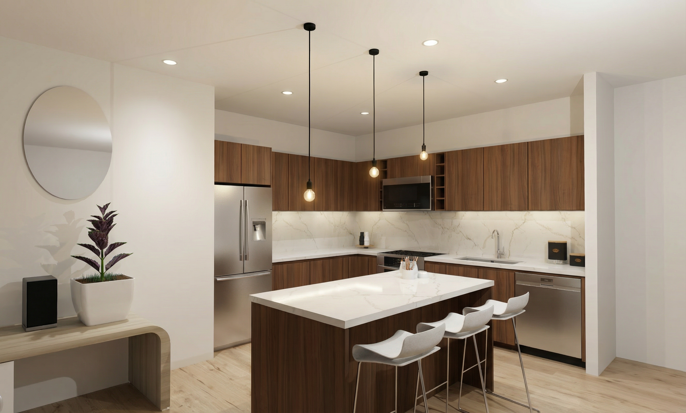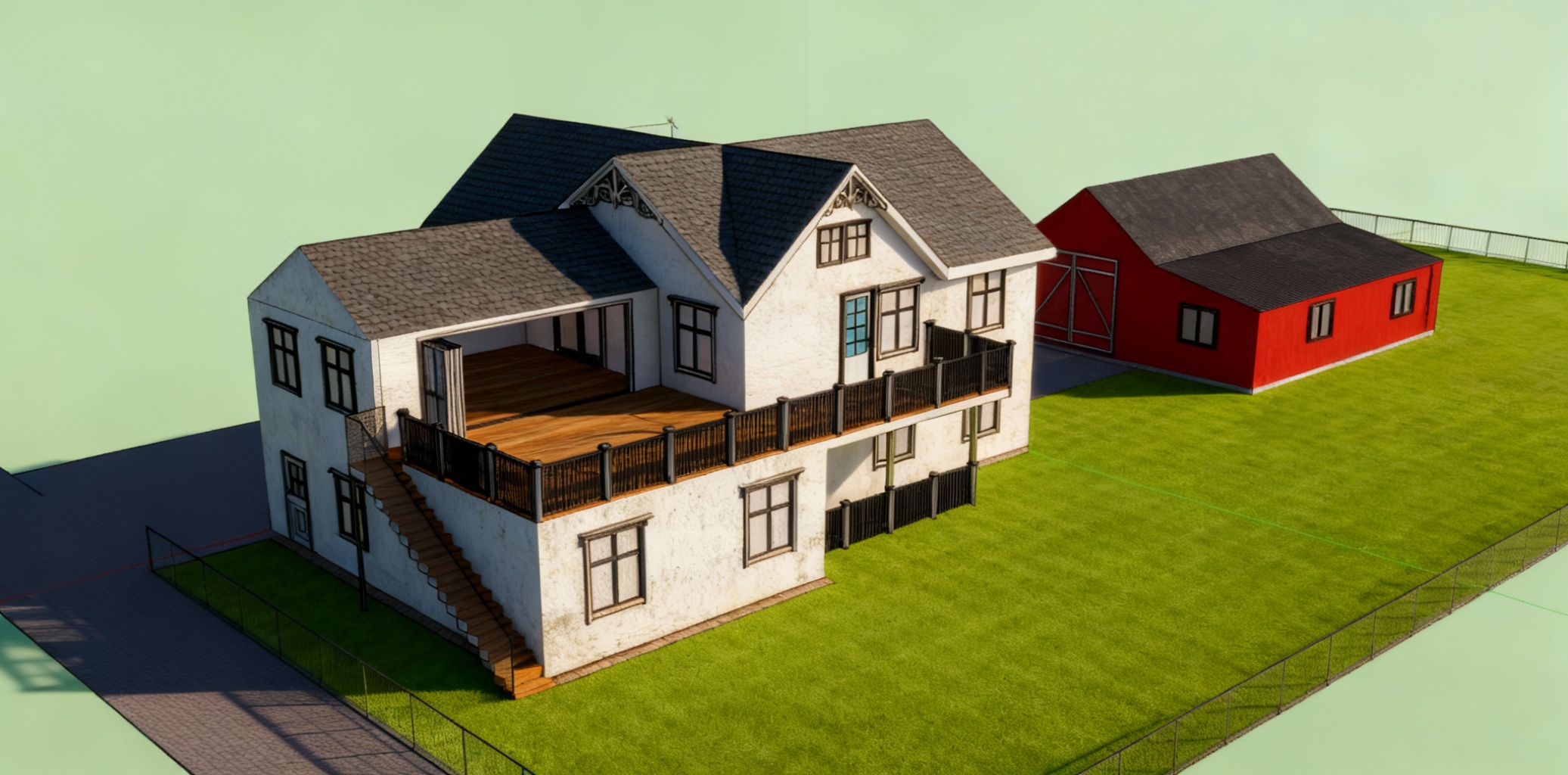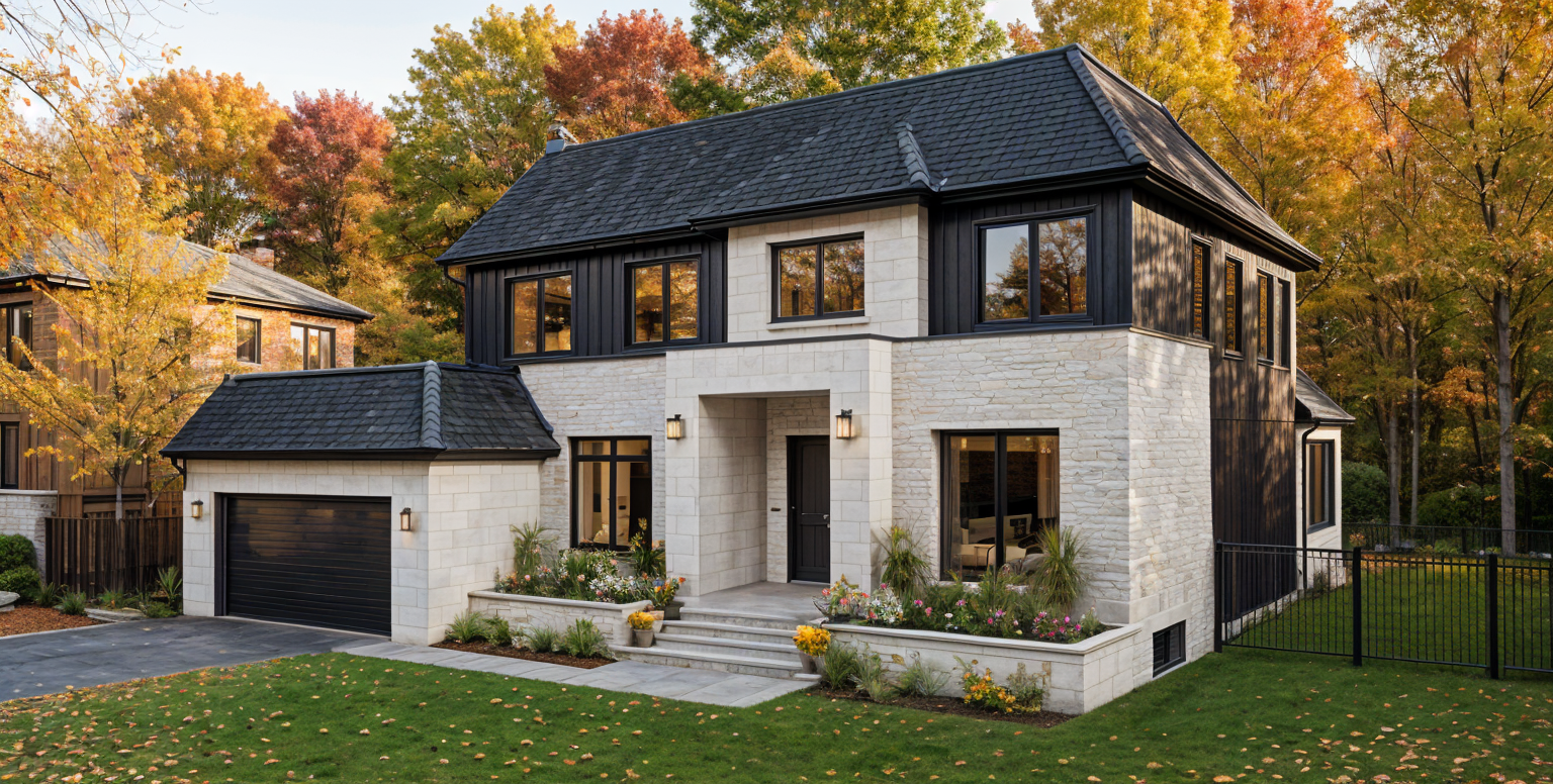 home is in a lightly wooded lot with one home about 30 feet away on the left the trees in the backyard are about 80 feet away there will be a metal picket fence 6 tall on the left hand side of the property the season is autmn so the trees along the rear and side will be somehat colourful there should be some subtle tasteful landscaping in the fron planters with low bushes and flowers ensure all windows and doors are rendered and not omitted