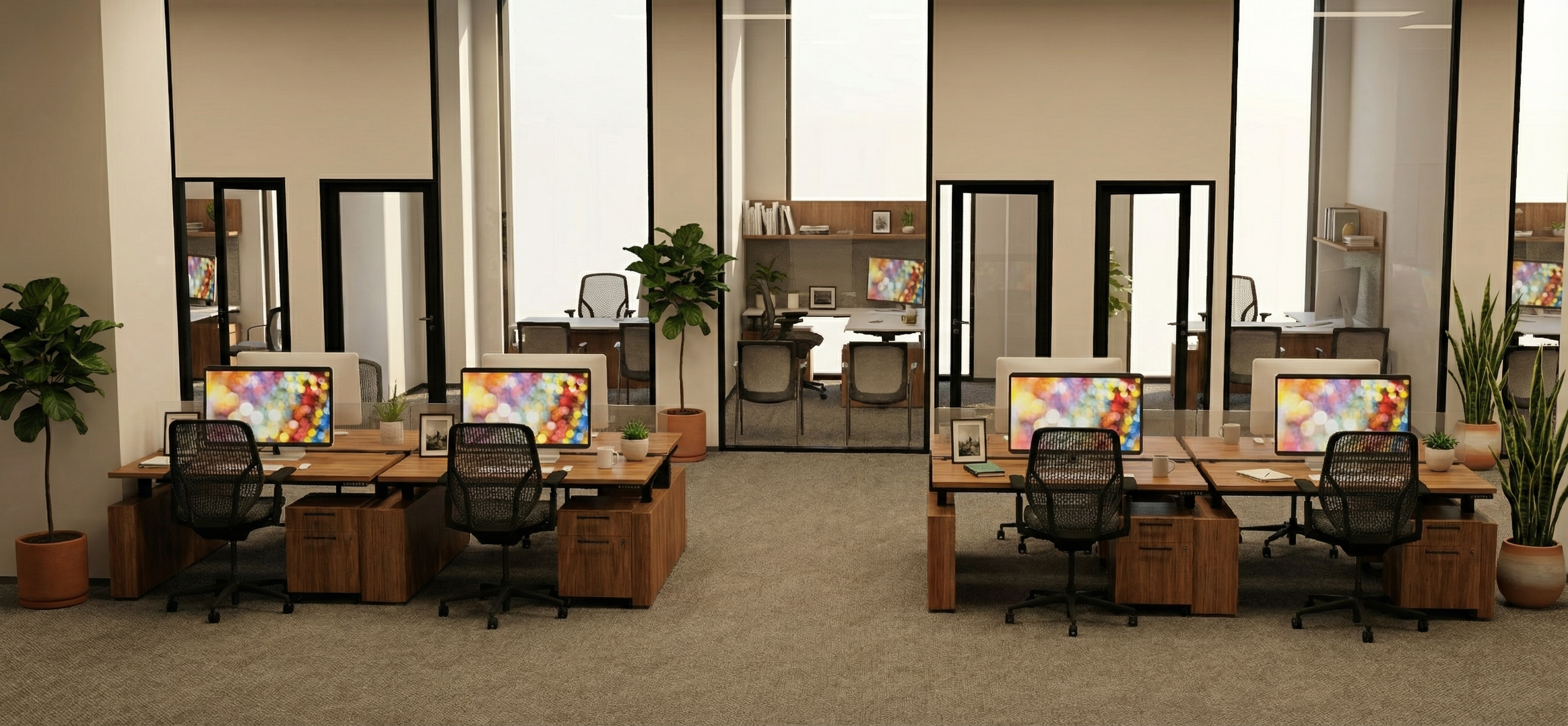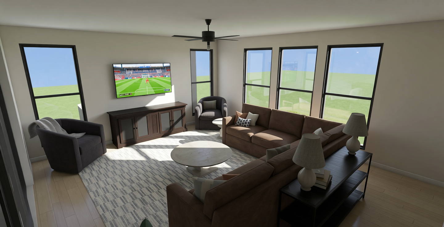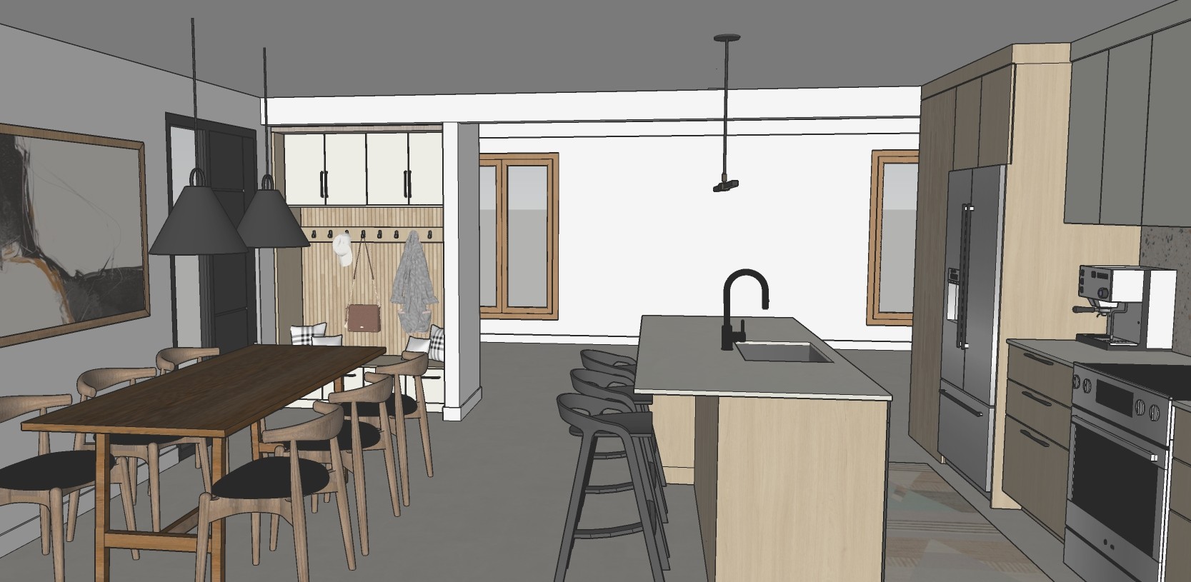 warm modern scandinavian kitchen add natural sunlight a person a patio behind the door and a rural landscape